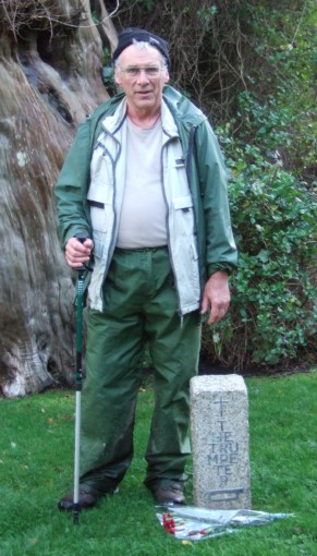 Me in wet-weather gear by the Trumpeter's stone in Selborne: someone had left flowers in his memory |