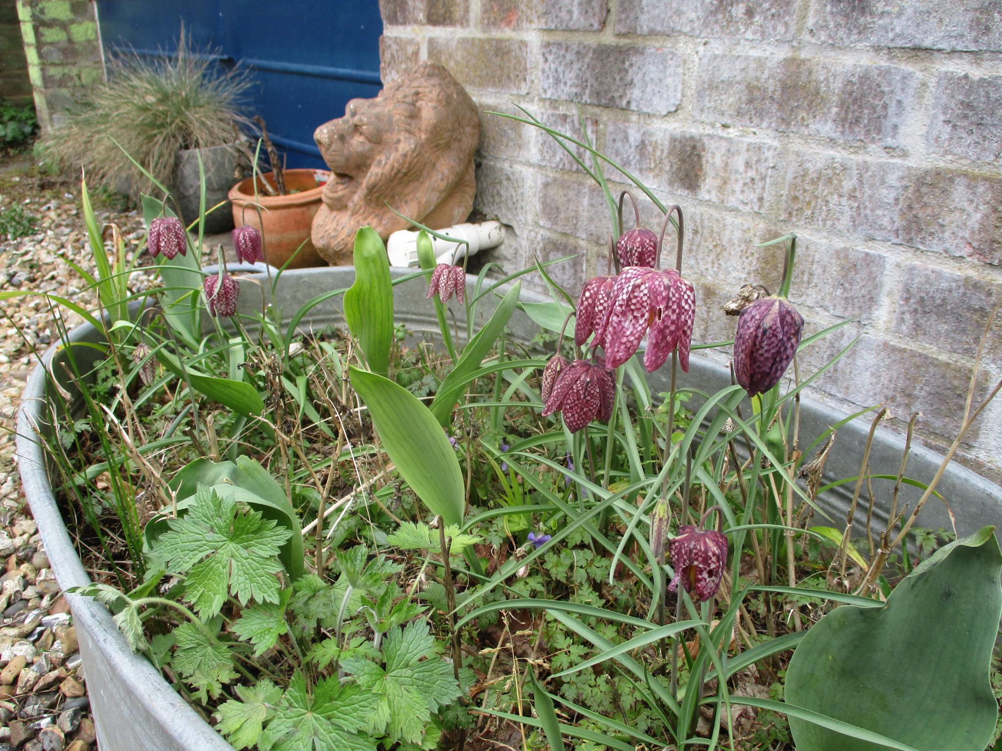 11th April 2022Did the annual clearing of the garden ponds today – on my knees groping under the surface to bring up whatever had fallen into them over the past 12 months. Never a nice job. But what is nice are the several Snakeshead Fritillaries (see pic) which have come up in our tin bath by the front door – I think we planted them a year or two ago, but this is the first time we've seen them in abundance. Lovely, but strange plants. |