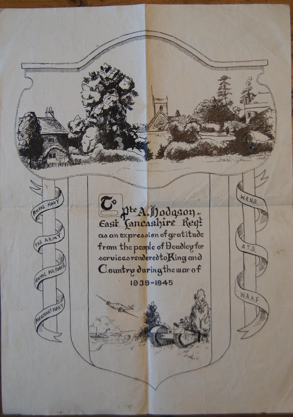 From Elaine Gouger, received October 2019: A Certificate of Honour for Private A HODGSON, designed by Hugh Thomson-Glover and given to all Headley men known to have served in WW2