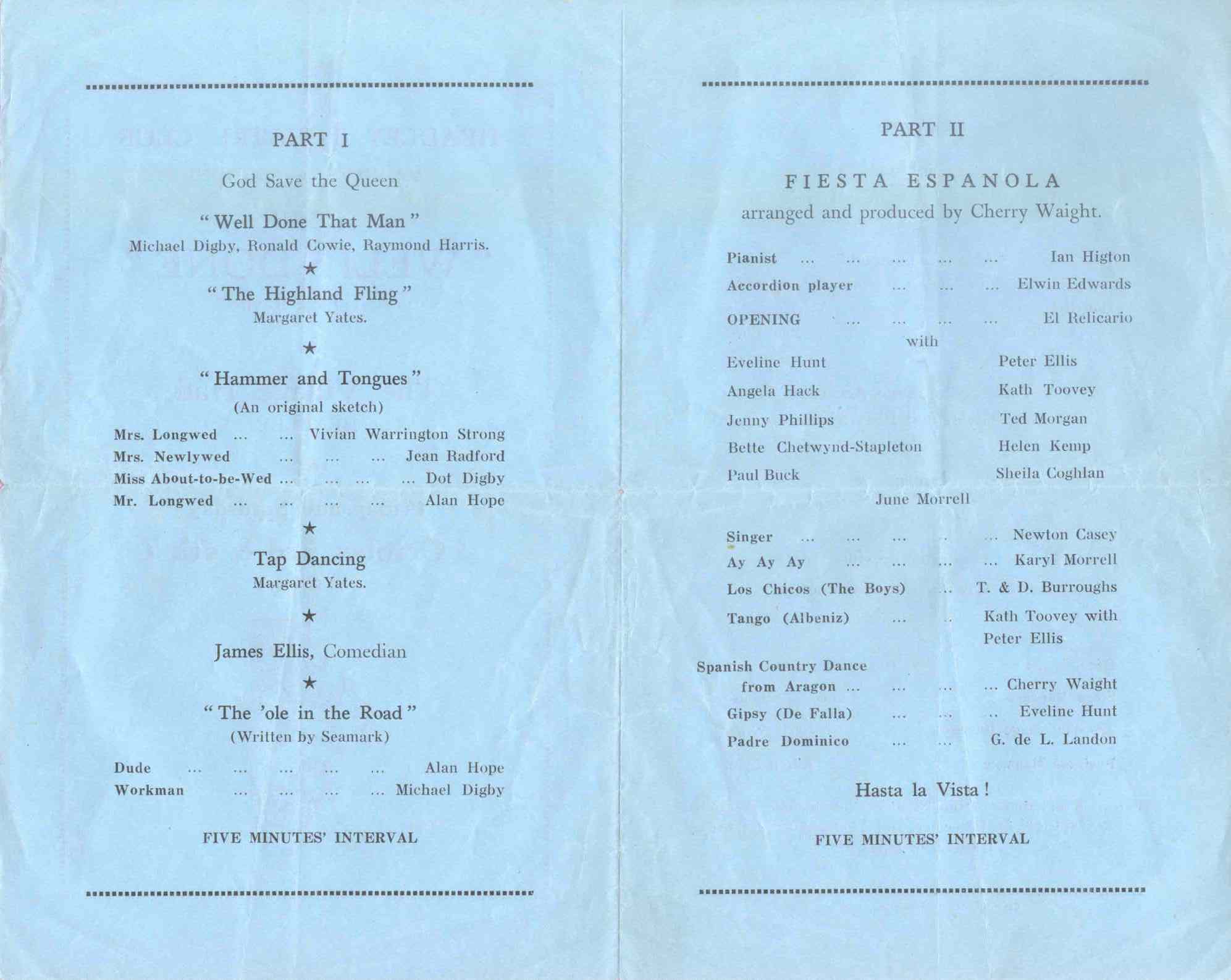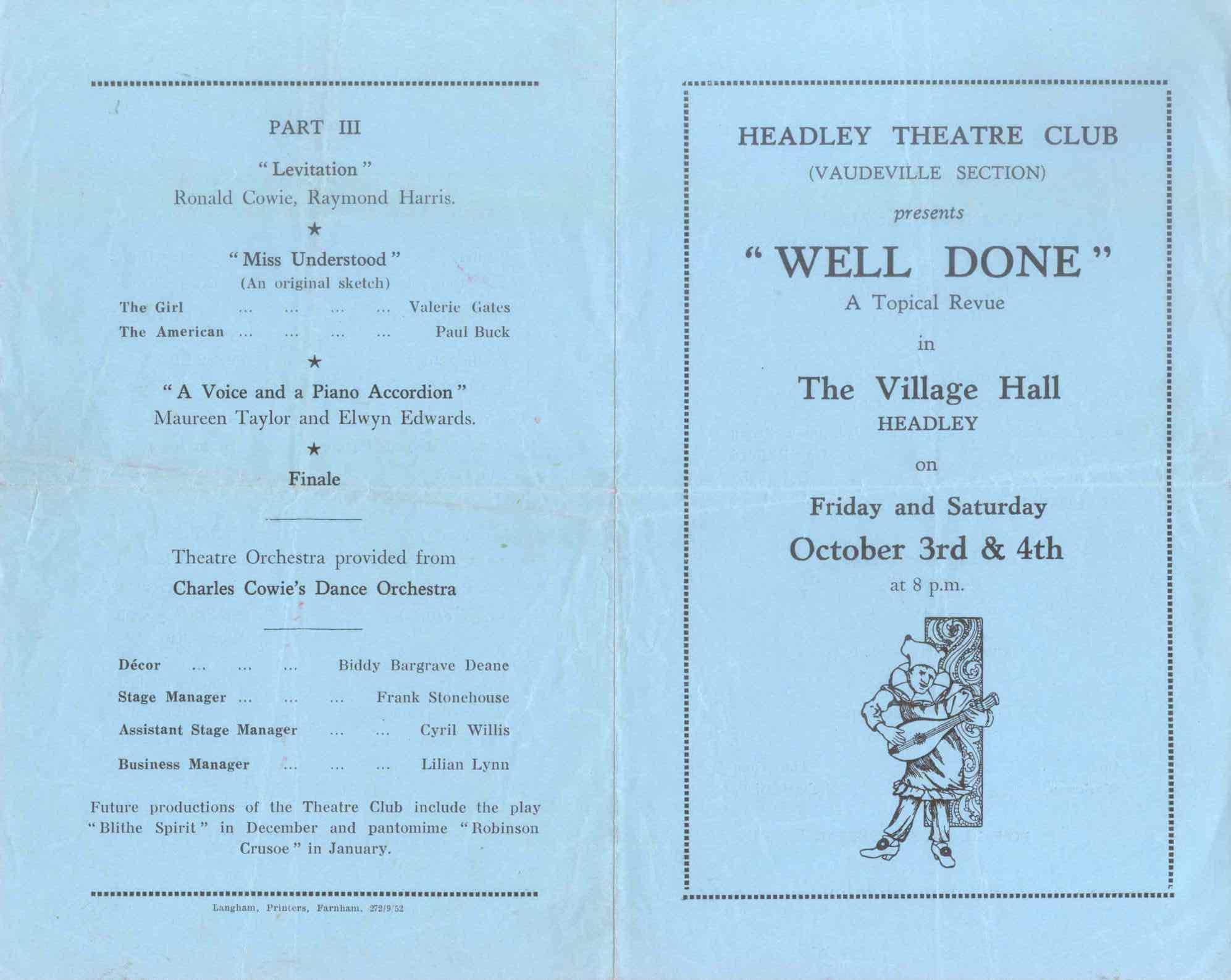 Programme for Headley Theatre Club's first ever production 'Well Done', October 1952