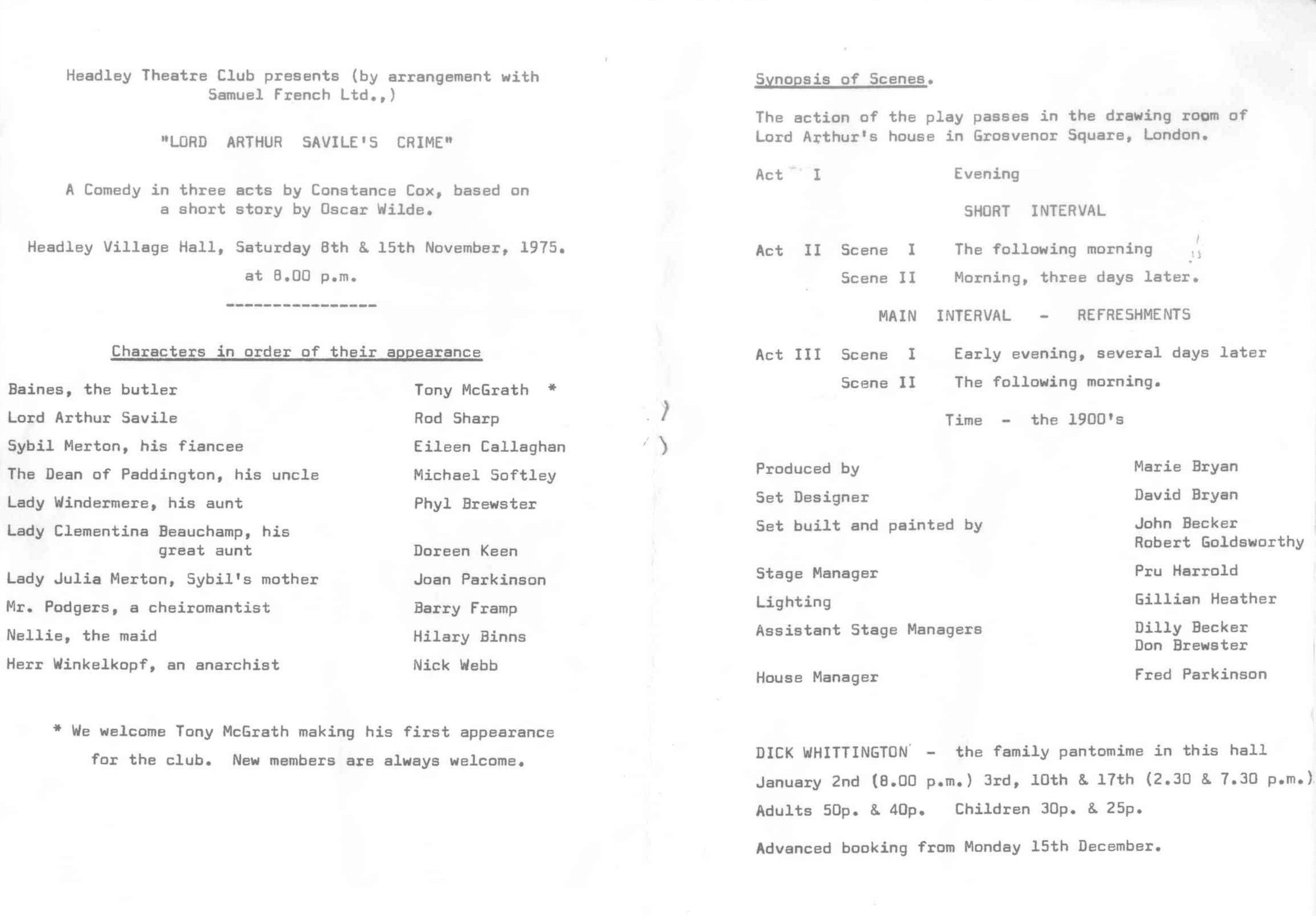 Programme of the Headley Theatre Club's production of 'Lord Arthur Savile's Crime', November 1975