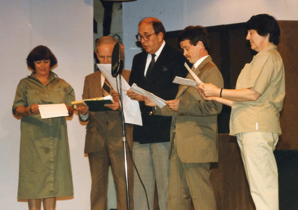 In the evening, we put a show on in the Village Hall, very similar to the one we did the year before to celebrate D-Day. Kay McGregor, Stan Sharp, John McGregor, Rod Sharp & Penny McKay doing a radio sketch |