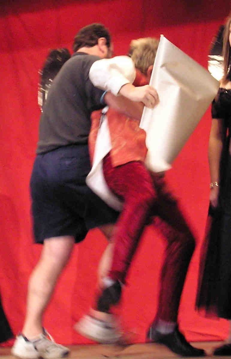 and gets carried off by the Stage Manager (Paul Heath) for his pains. |