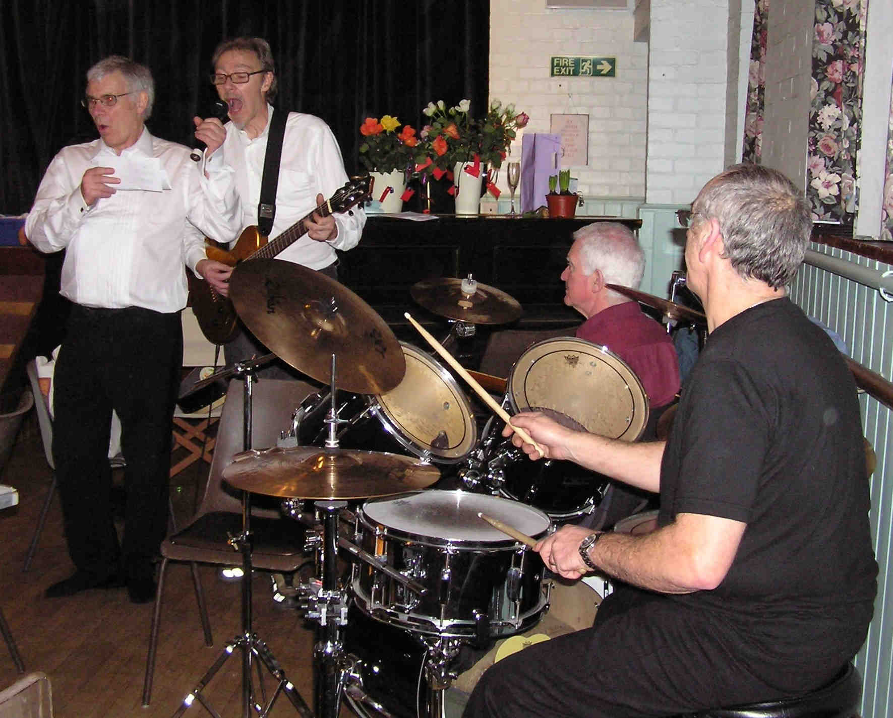 And finally we can relax! Director (Jo Smith), King Harold (David Burnham), guitarist (Martin Levy) and drummer/stage-hand (Paul Wareham) at the after-show party |