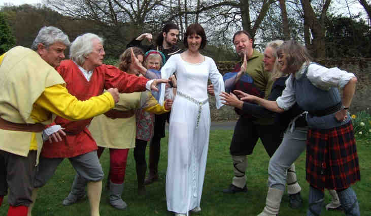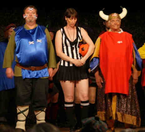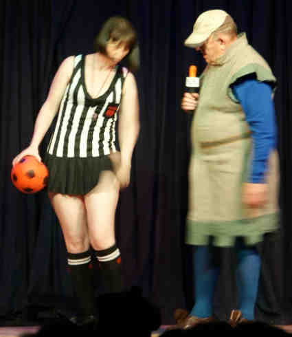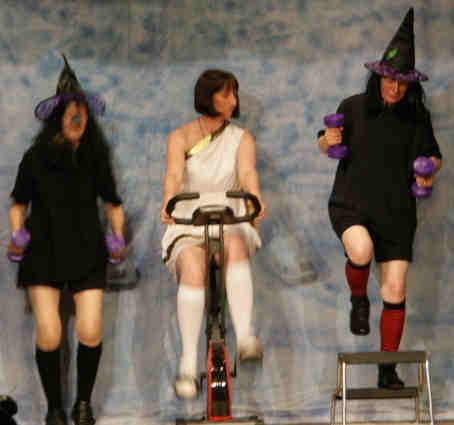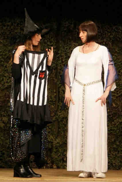 Witch 3 (Wendy Downs) and Witch 2 (Jo Levy) in their linesmen's kit, try to get fit with Lady Godiva |