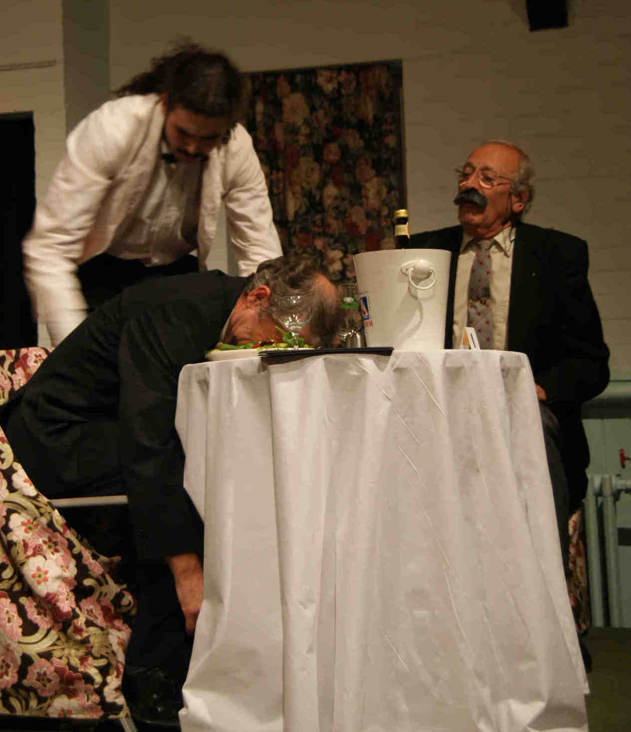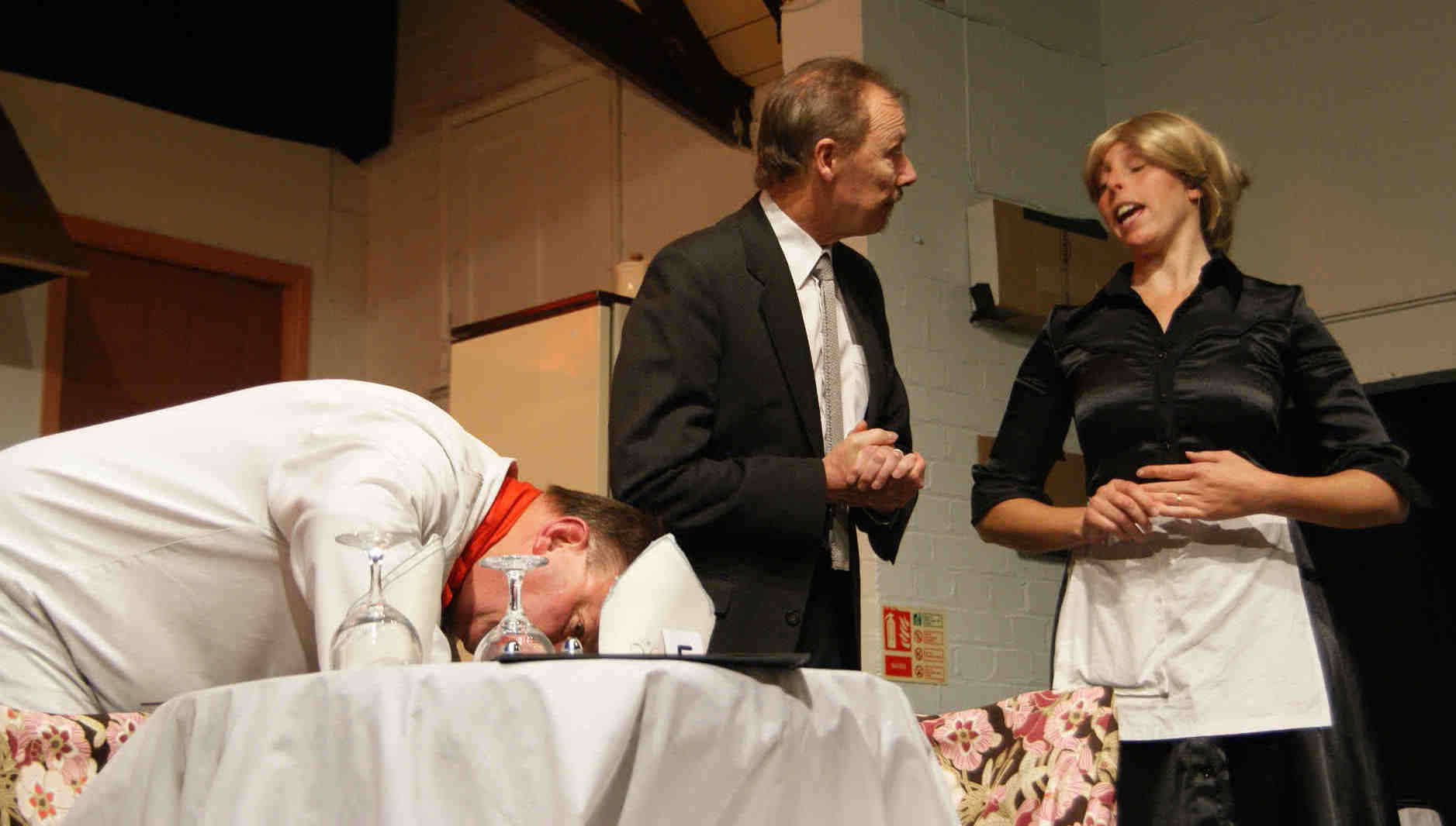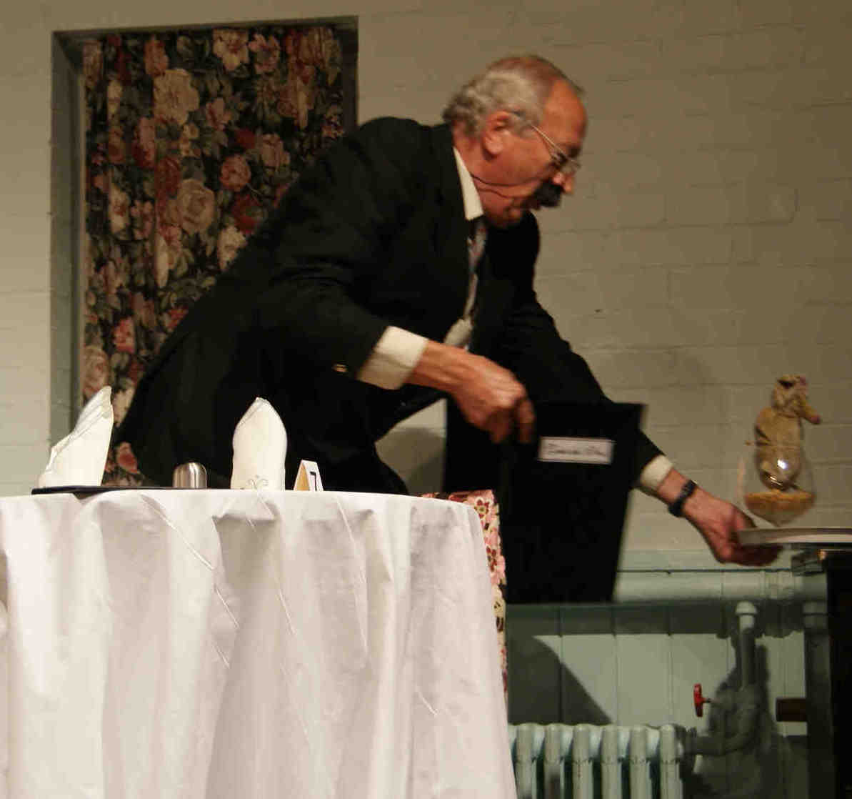 The ingenious staging, conceived by producer Nick Webb to be as faithful to the television layout of the hotel as possible, meant that the audience, instead of forming the "fourth wall", merged with the set and the action as they joined the stage diners in an excellent 3-course meal, appropriate to the skills of cheeky hotel chef Terry (ably played by Martin Wellen). The superb set, assembled by Paul Wareham and Paul Heath, was perfect in every detail, from the fully equipped kitchen with two fridges, no less to the very convincing rat in the biscuit box; the whole was overseen by a superb moose-head, constructed by Johnny Preskett who also played Mr Walt.