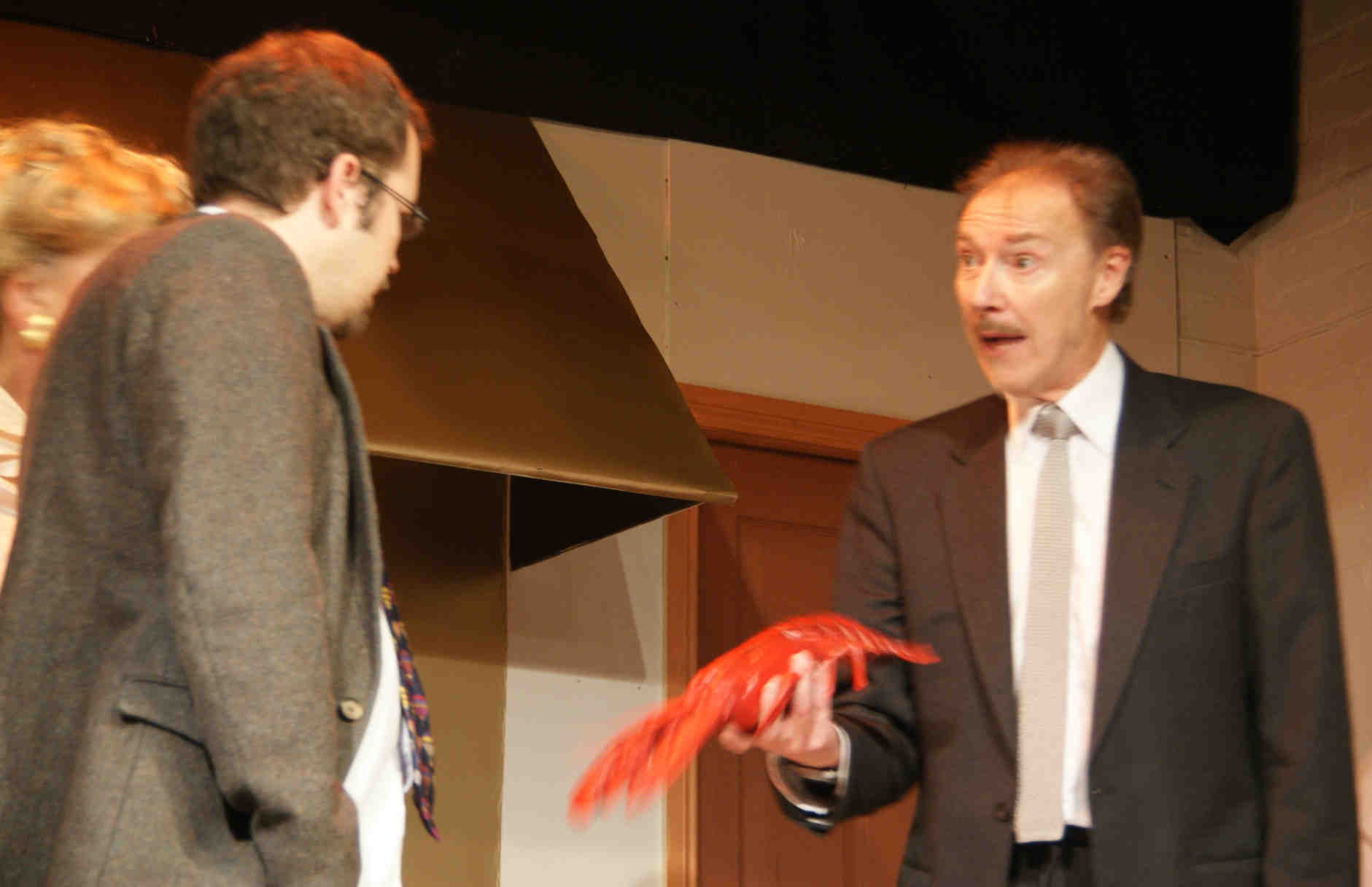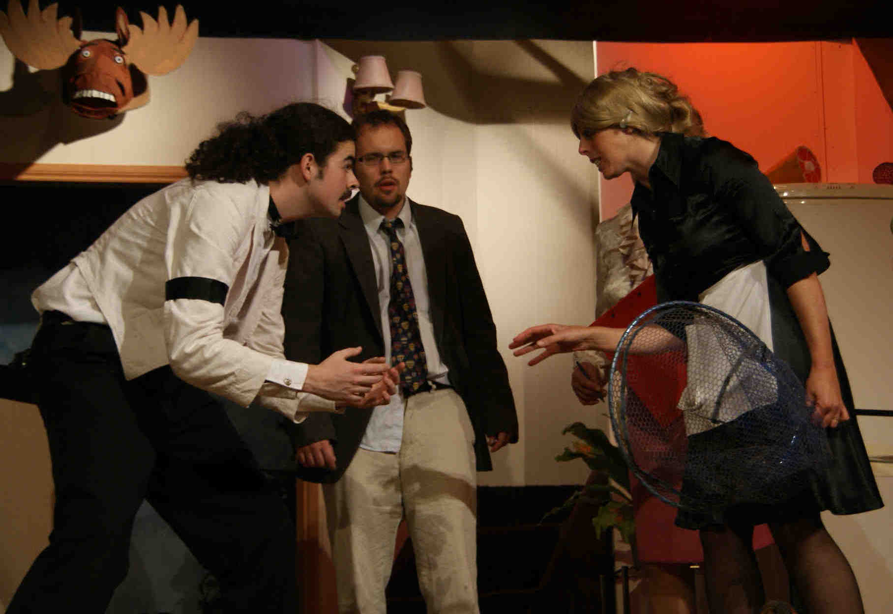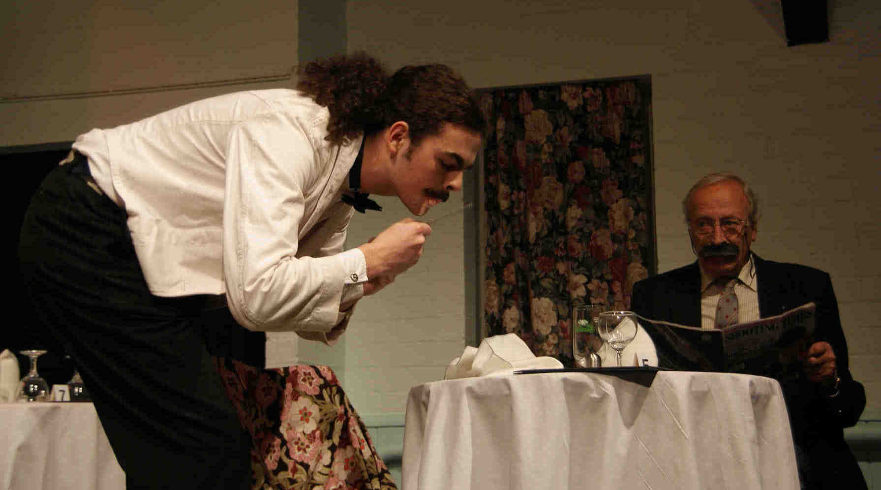 The ingenious staging, conceived by producer Nick Webb to be as faithful to the television layout of the hotel as possible, meant that the audience, instead of forming the "fourth wall", merged with the set and the action as they joined the stage diners in an excellent 3-course meal, appropriate to the skills of cheeky hotel chef Terry (ably played by Martin Wellen). The superb set, assembled by Paul Wareham and Paul Heath, was perfect in every detail, from the fully equipped kitchen with two fridges, no less to the very convincing rat in the biscuit box; the whole was overseen by a superb moose-head, constructed by Johnny Preskett who also played Mr Walt.