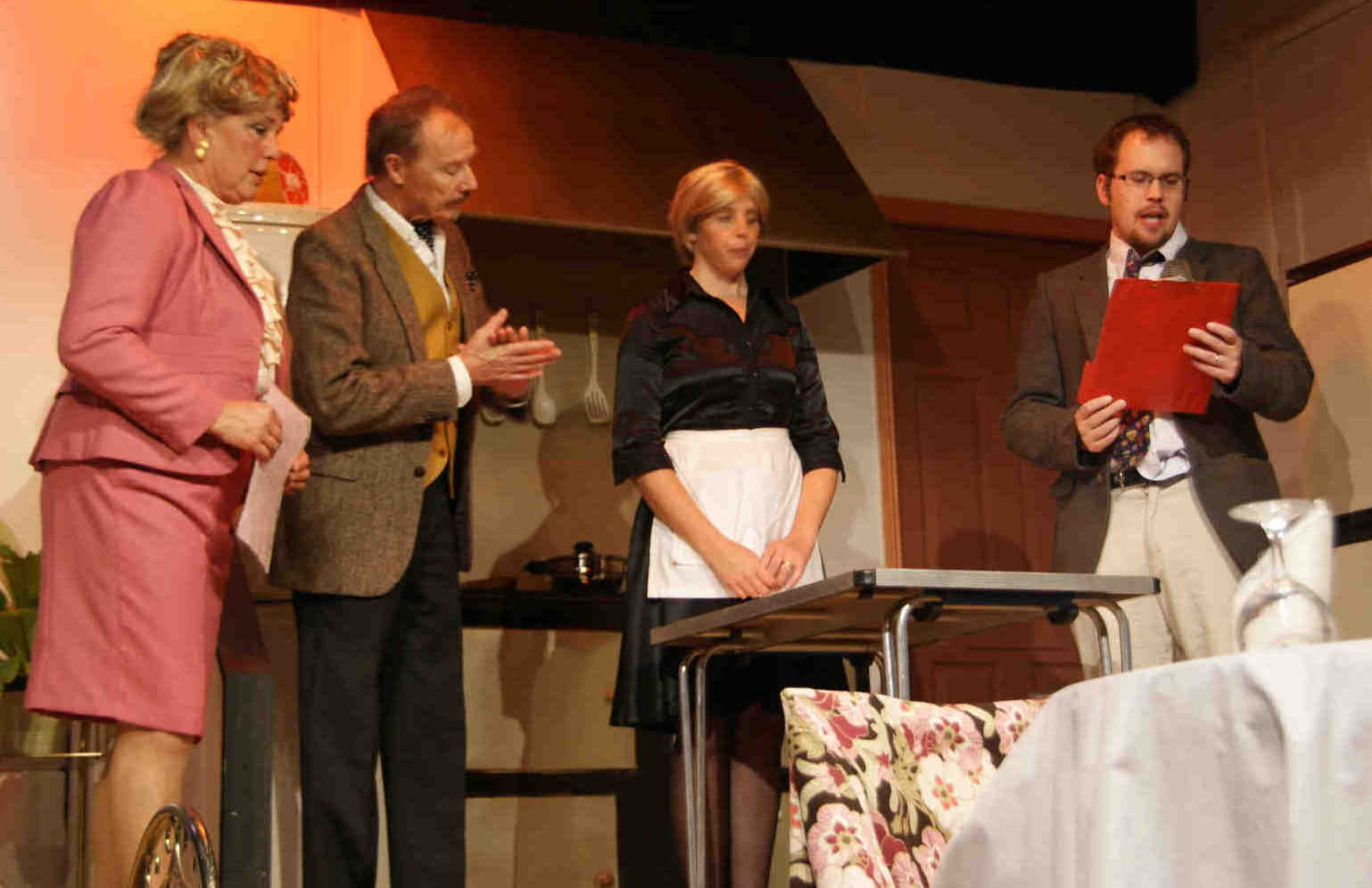 The Village Hall stage is a small one, but no-one would have thought so looking at the excellent set design for this show. Somehow the reception area, behind which Basil hid on several occasions when mayhem raged around him, the doorway to the kitchen, and several tables for diners, managed to exist together without any sign of congestion, though a number of guests did suffer from indigestion when rat poison inadvertently was added to the quiche for extra flavour! The Stage Crew led by Paul Heath deserve praise for the design and construction of the set.