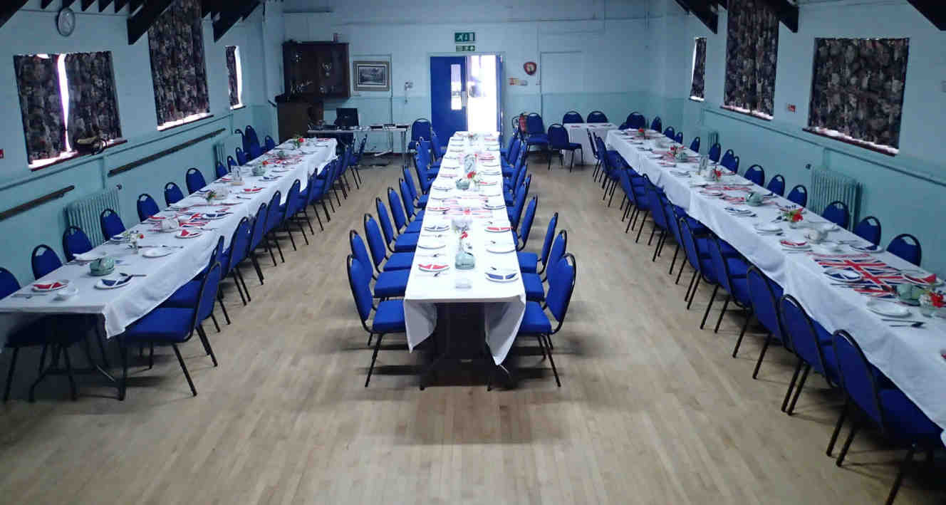 How we set the tables out in the Hall. There was also three gazebos outside : one for food prep, one for men's changing, and one for Zak's games and sales. |