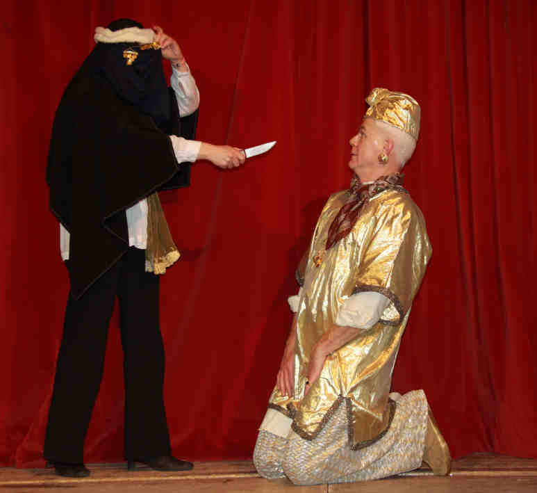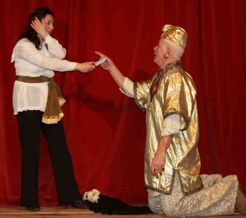 The Sultan (Rod Sharp) and Executioner (Shirley Neil) wait to hear the last tale of Sheherezade (Karina Farnlucher), who seems to be eying up the Exit sign already! |