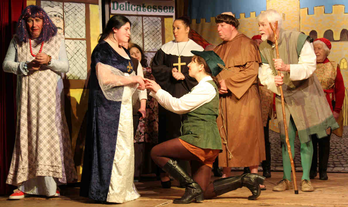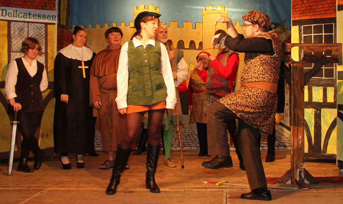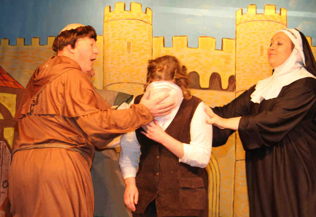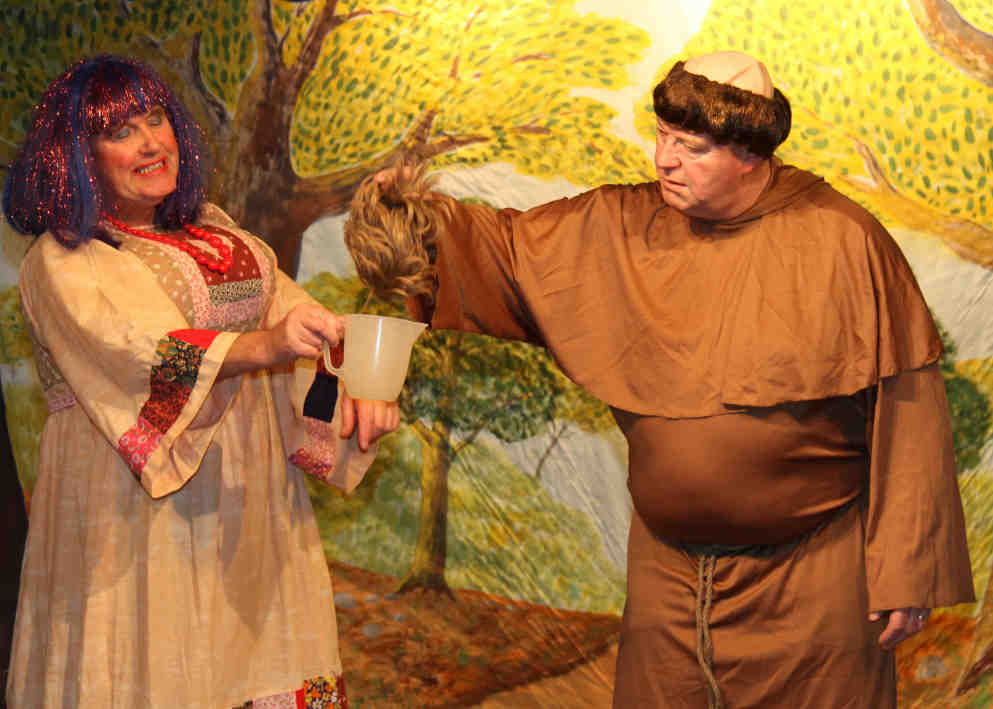 Custard pies? In a pantomime?? Much Binding (Abby Hibberd) gets it from Friar Tuck (Martin Wellen) while Nun Better (Karina Farnlucher) looks on |
