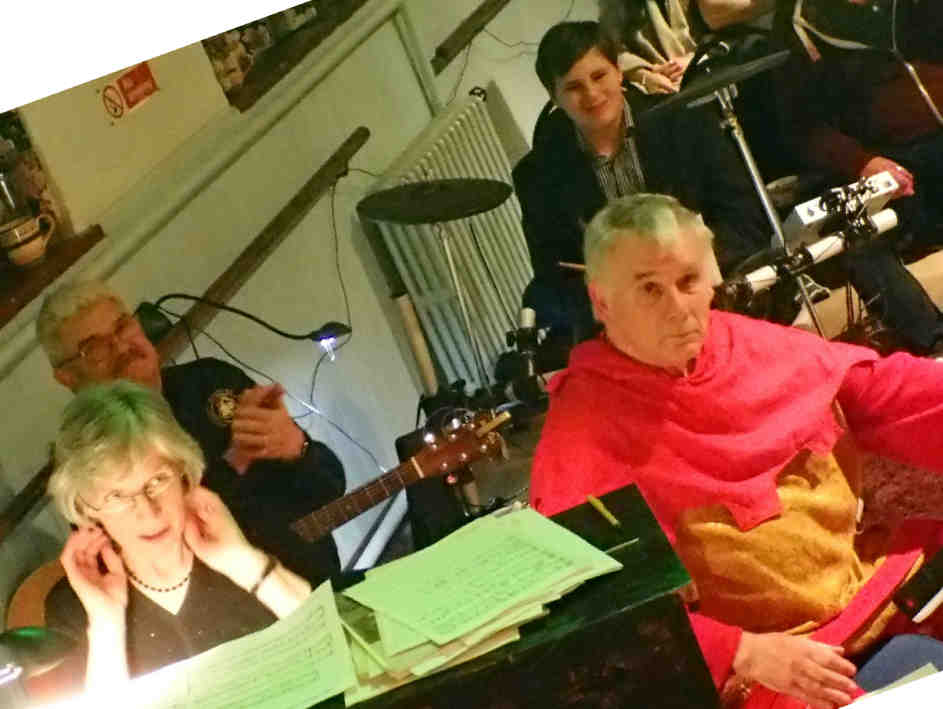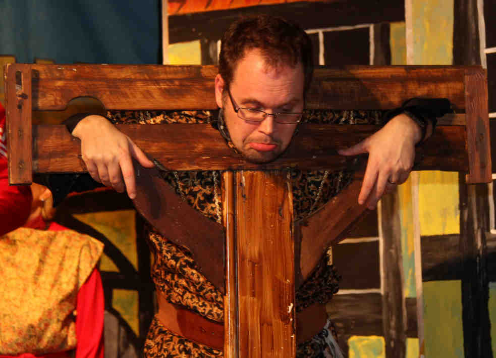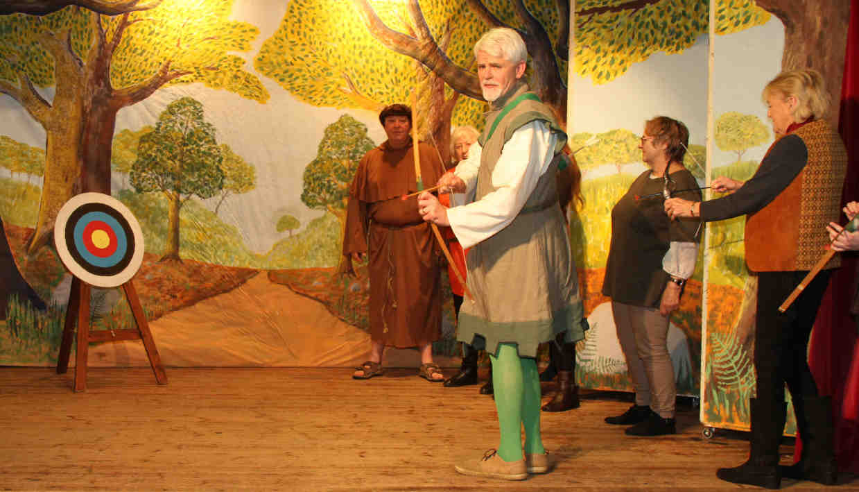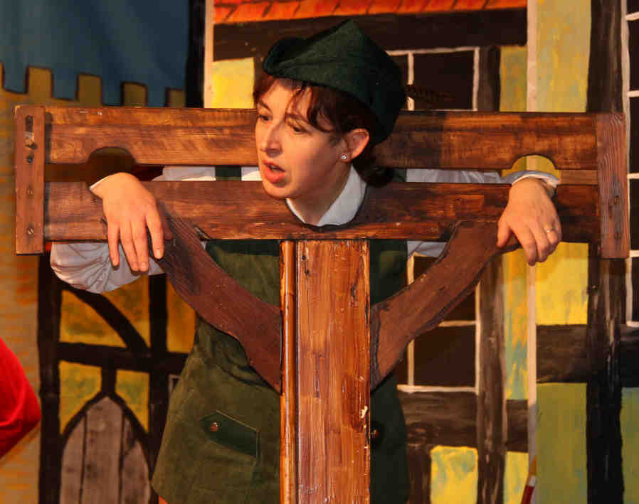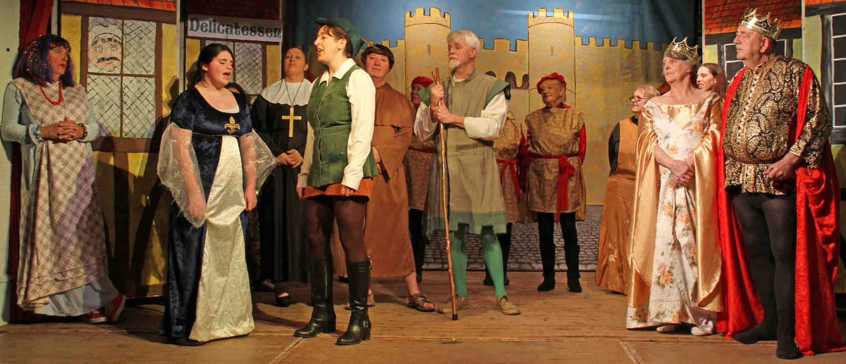 Custard pies? In a pantomime?? Much Binding (Abby Hibberd) gets it from Friar Tuck (Martin Wellen) while Nun Better (Karina Farnlucher) looks on |