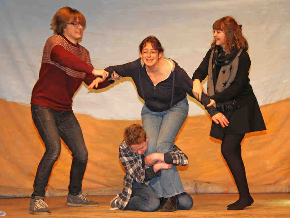 The sheriff's men (Thomas Edser, Thomas Hiller, Jess Shaw) manhandle Robin (Rachel Spiller) |