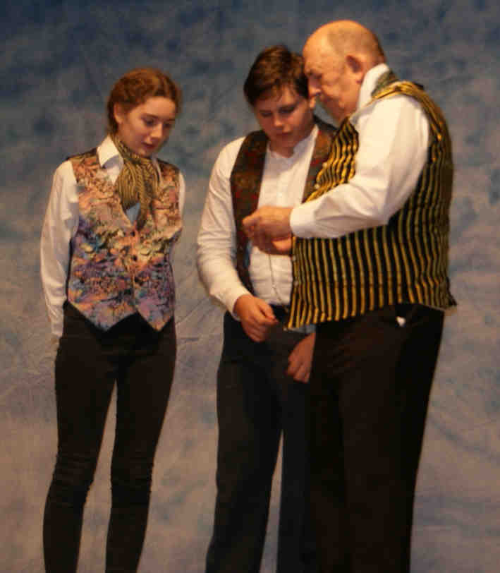 He sees his first employer Mr Fezziwig (John McGregor, right) with his youthful self (Zak White, middle) and his pal Dick (Tiana Howard). |