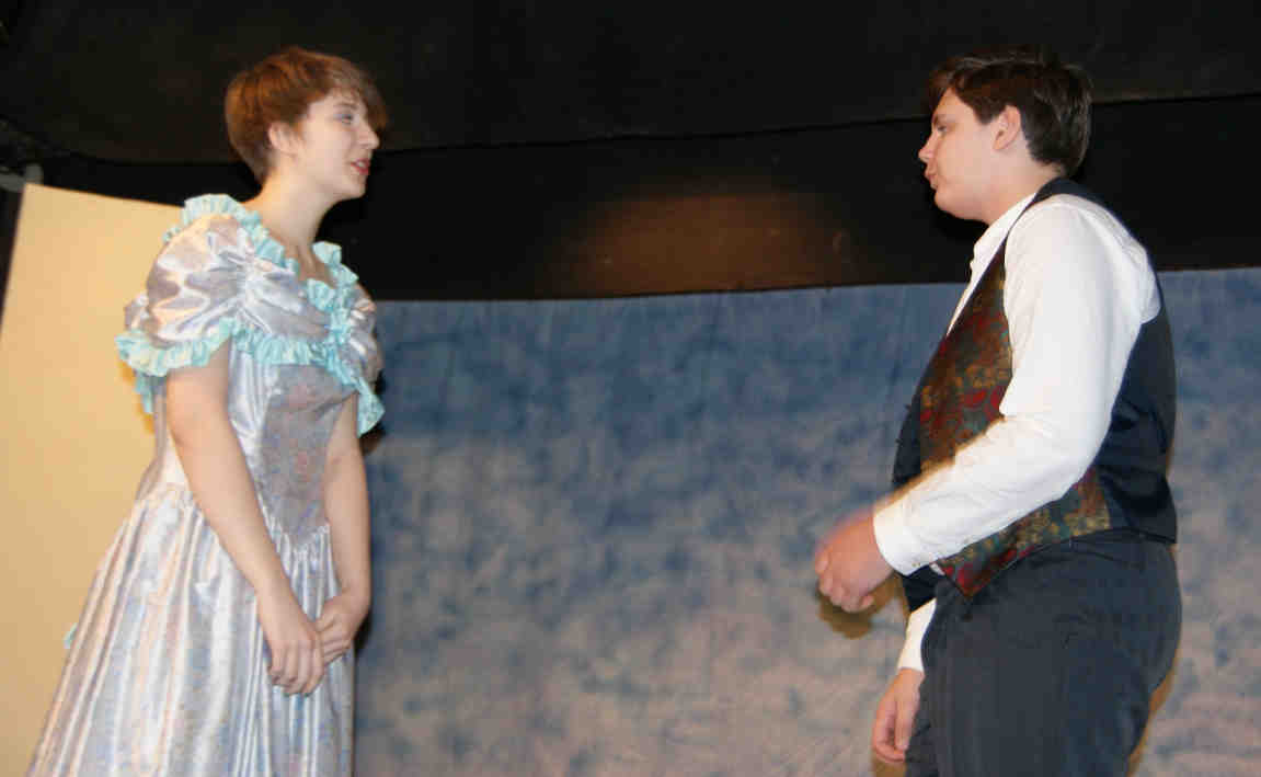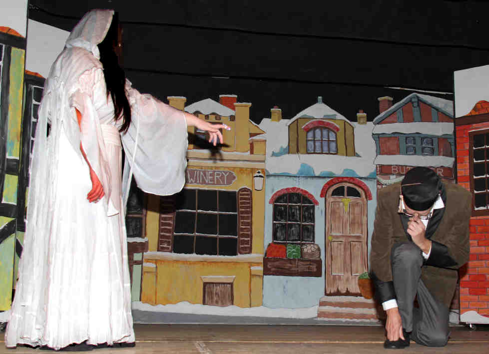 The Ghost of Christmas Past (Rachel Spiller) with Scrooge (David Burnham) near a too-modern post box! |