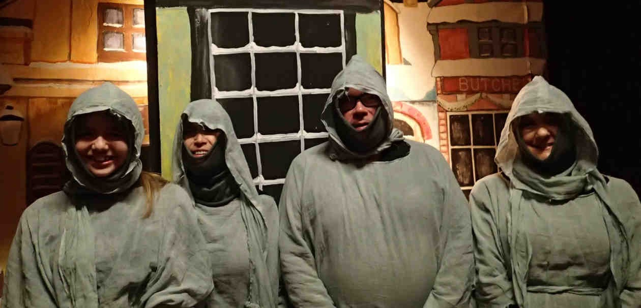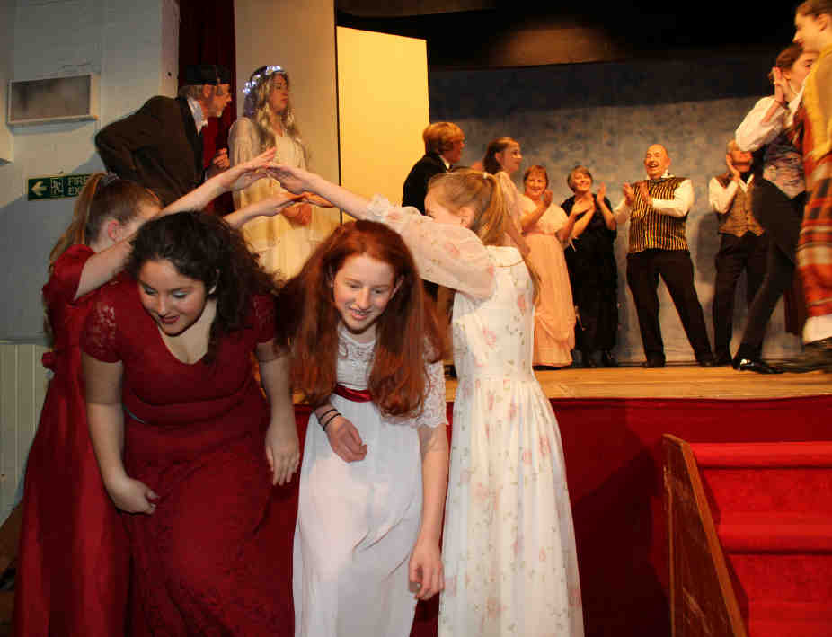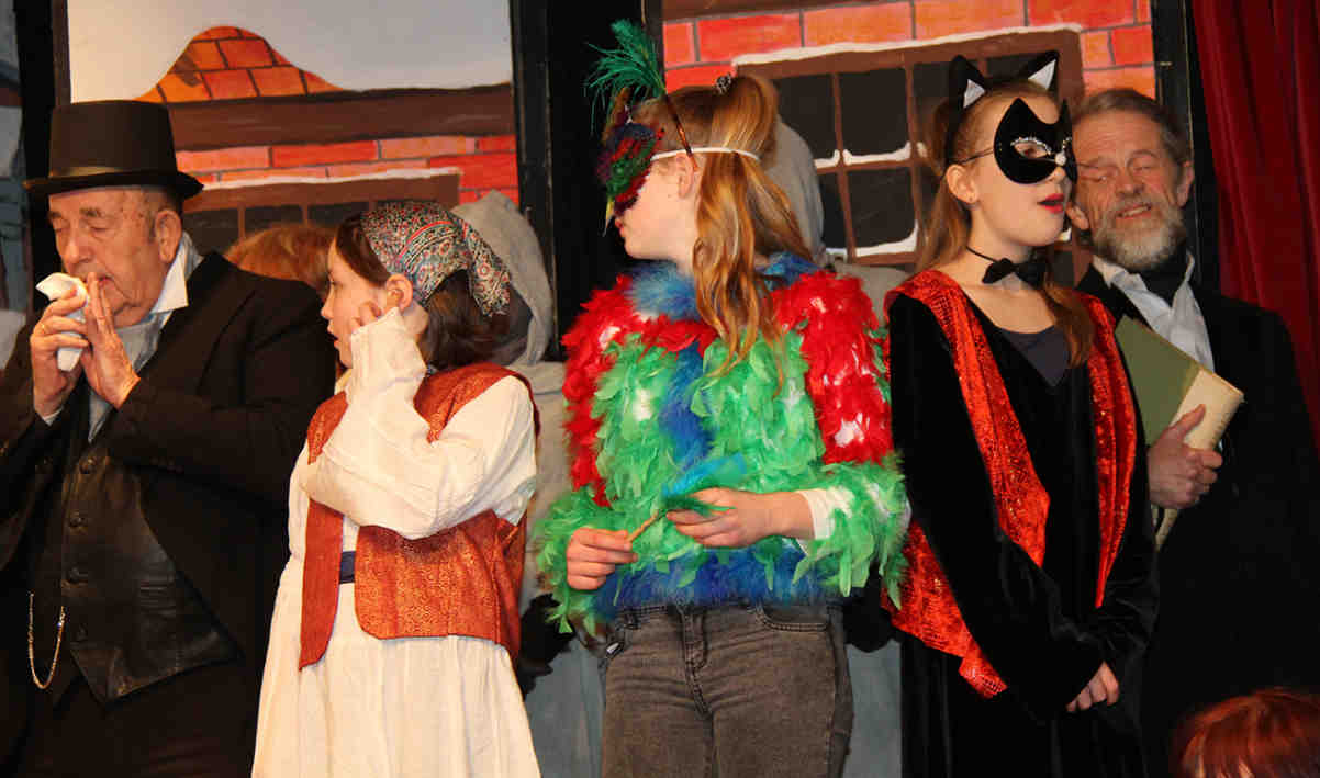 Through his window (held aloft by 'shades' Ellie Bradford and Kevin Stephenson) he spies a boy (Toby Spiller) and sends him to find the biggest turkey and take it to the Cratchits |