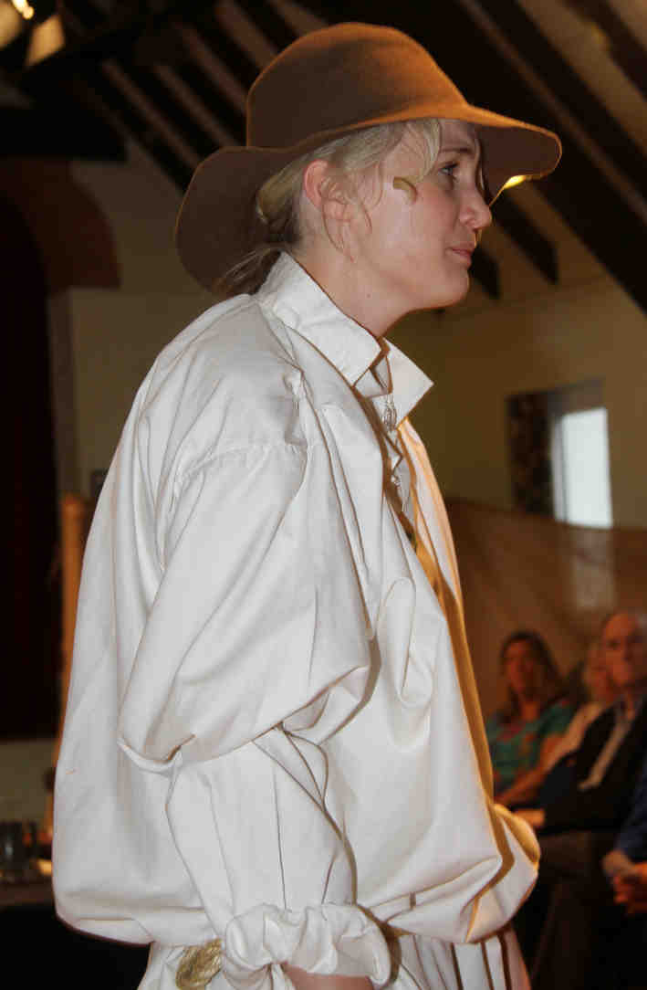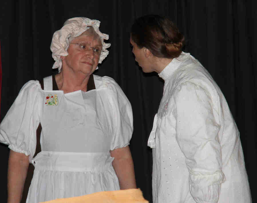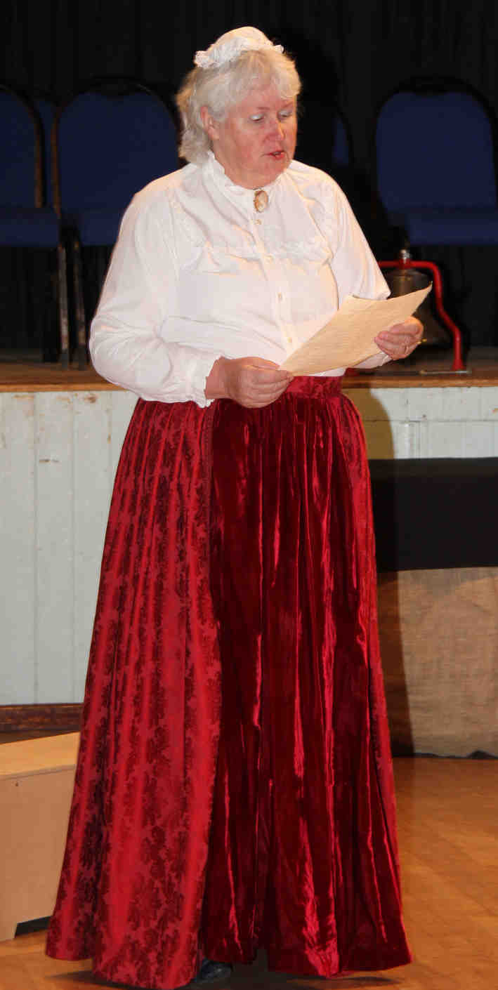Mrs Lickfold (Abby Hibberd), a shopkeeper's wife in Headley, keeps the audience informed as to what's going on. |
