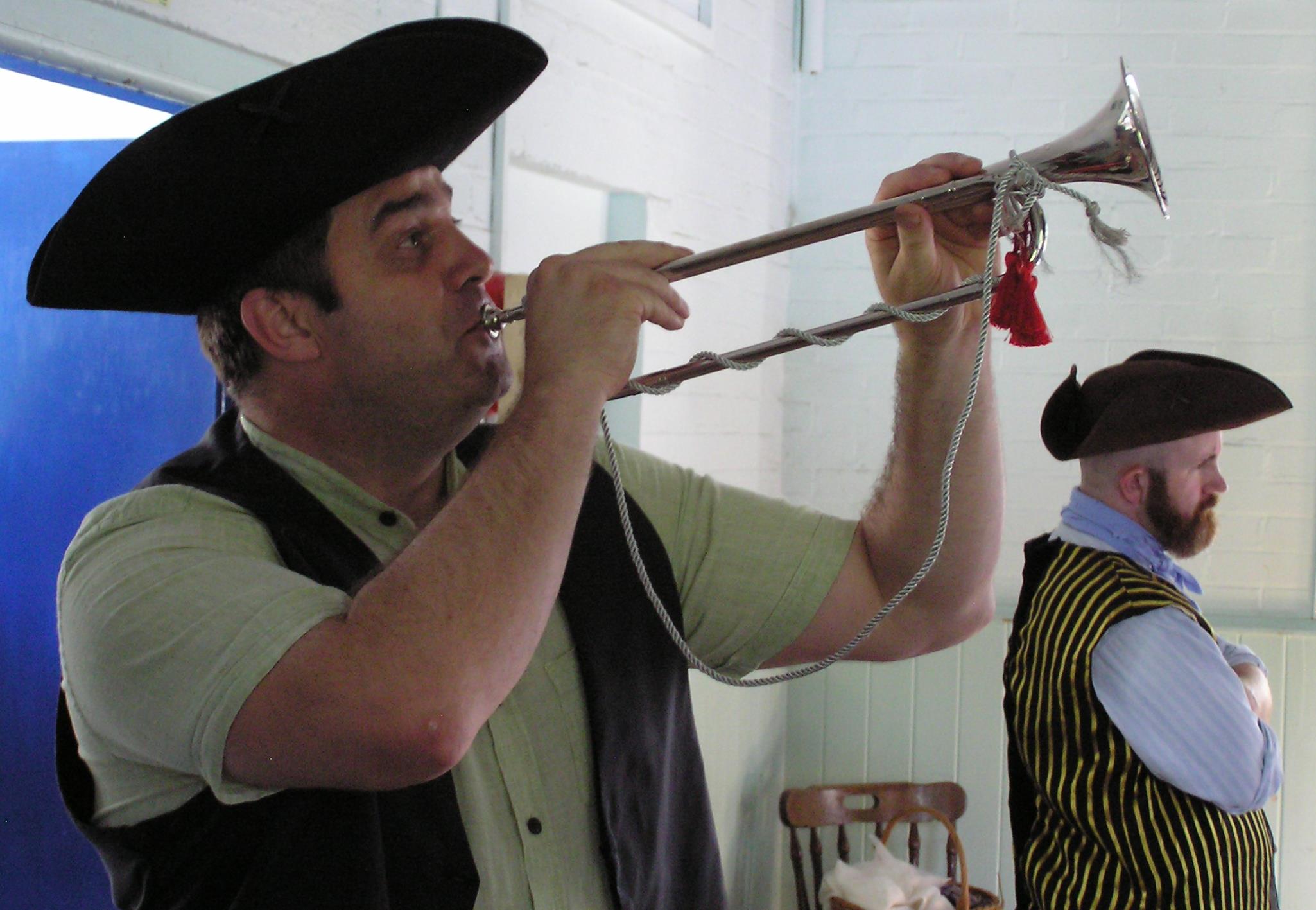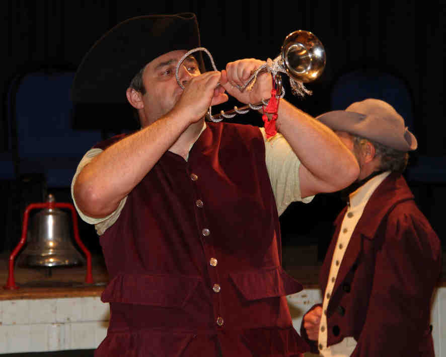 The 'Trumpeter' (Robbie Miller) tries in vain to stop them. |