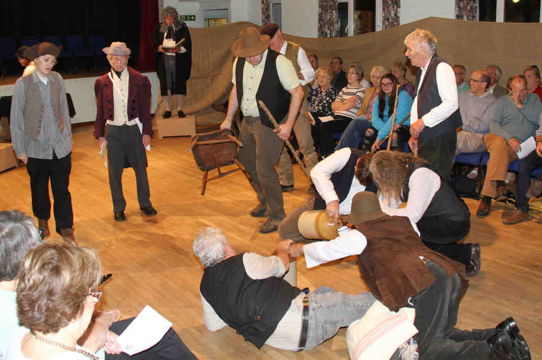 Eli Smith (Sorrel Wood), farmer of Headley, marches to the workhouse hoping for the help of bystanders (picked from the audience), but they just want to 'join in the fun'. |