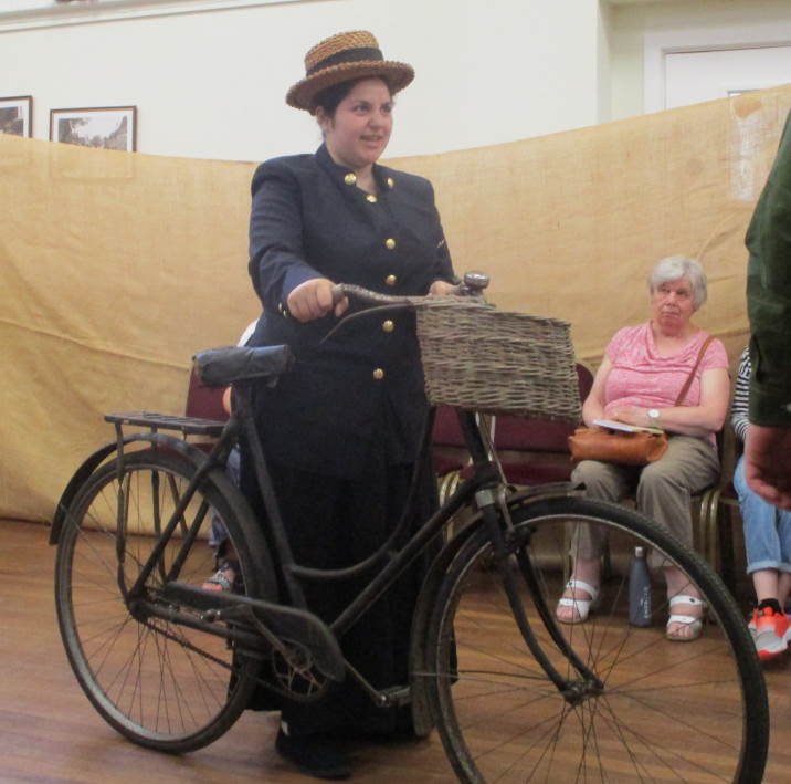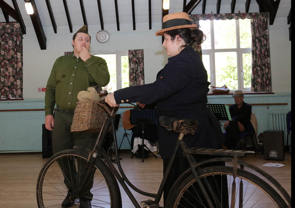 | Canadian Sgt John Mumford bumps into 'Louie' Woods with her ancient bicycle, in Liphook during the First World War in 1916 |