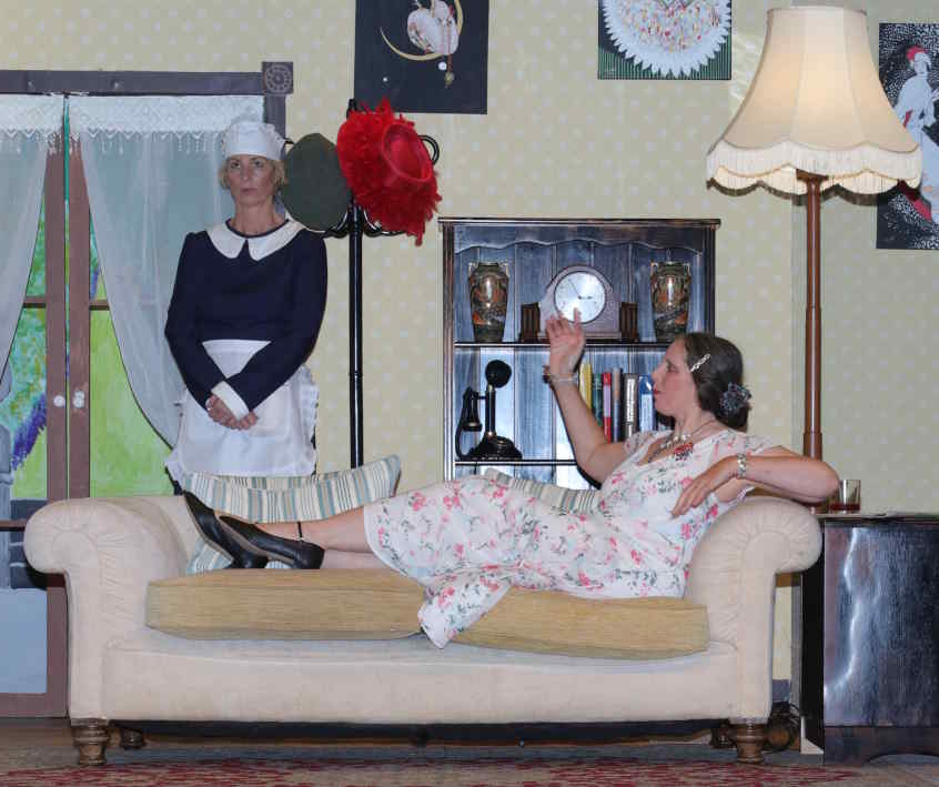 Sorel Bennett (Mel White) enters from the garden and tries to draw Edward's attention away from the Daily Mail crossword |