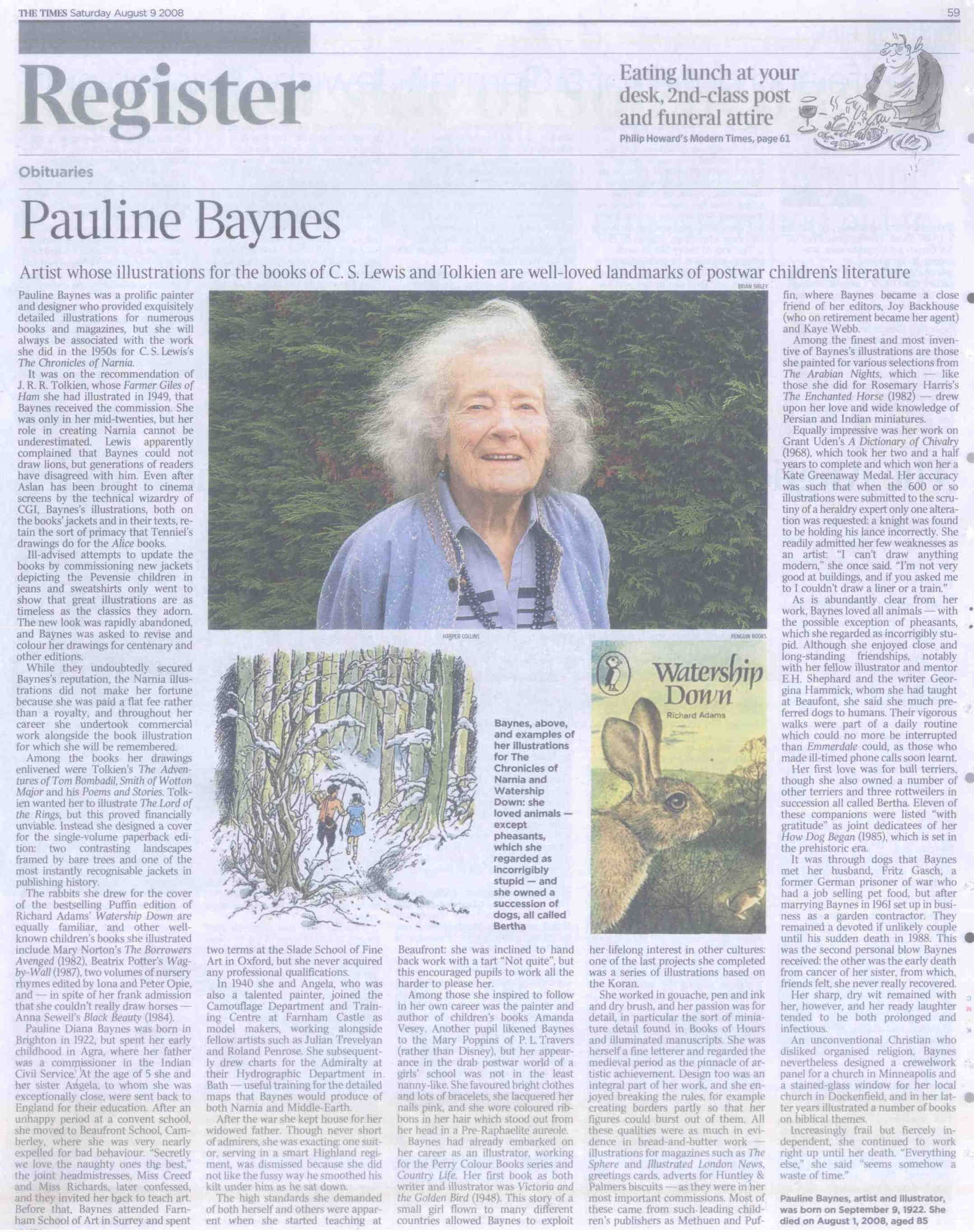 Baynes (married name Gasch), Pauline, artist whose illustrations for the books of CS Lewis and JRR Tolkien are well-loved landmarks of post-war children's literature – lived in Rock Barn Cottage, the last house in Headley on Heath Hill, the road past Mellow Farm to Dockenfield died 1st August 2008 aged 85 (see Times obituary)