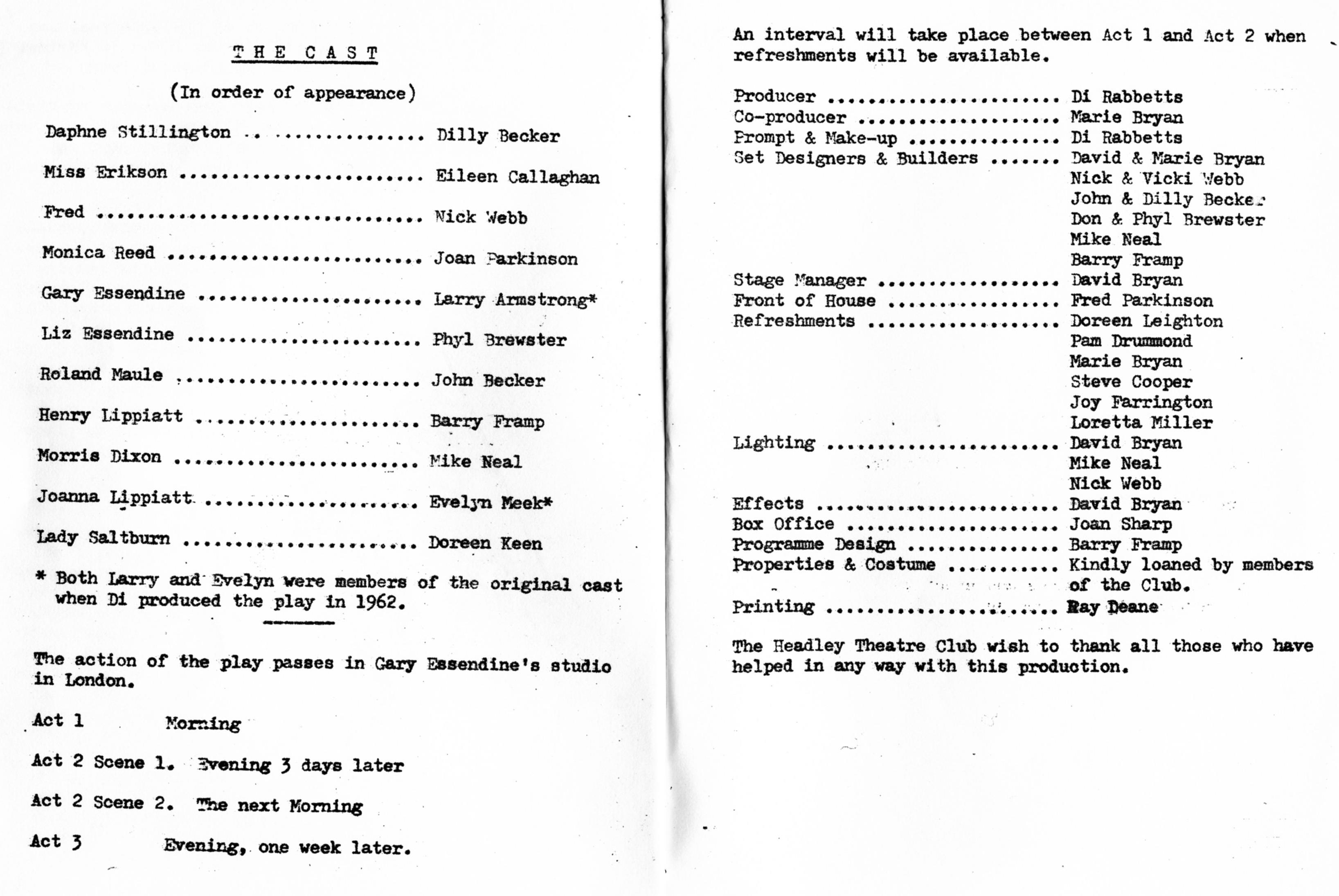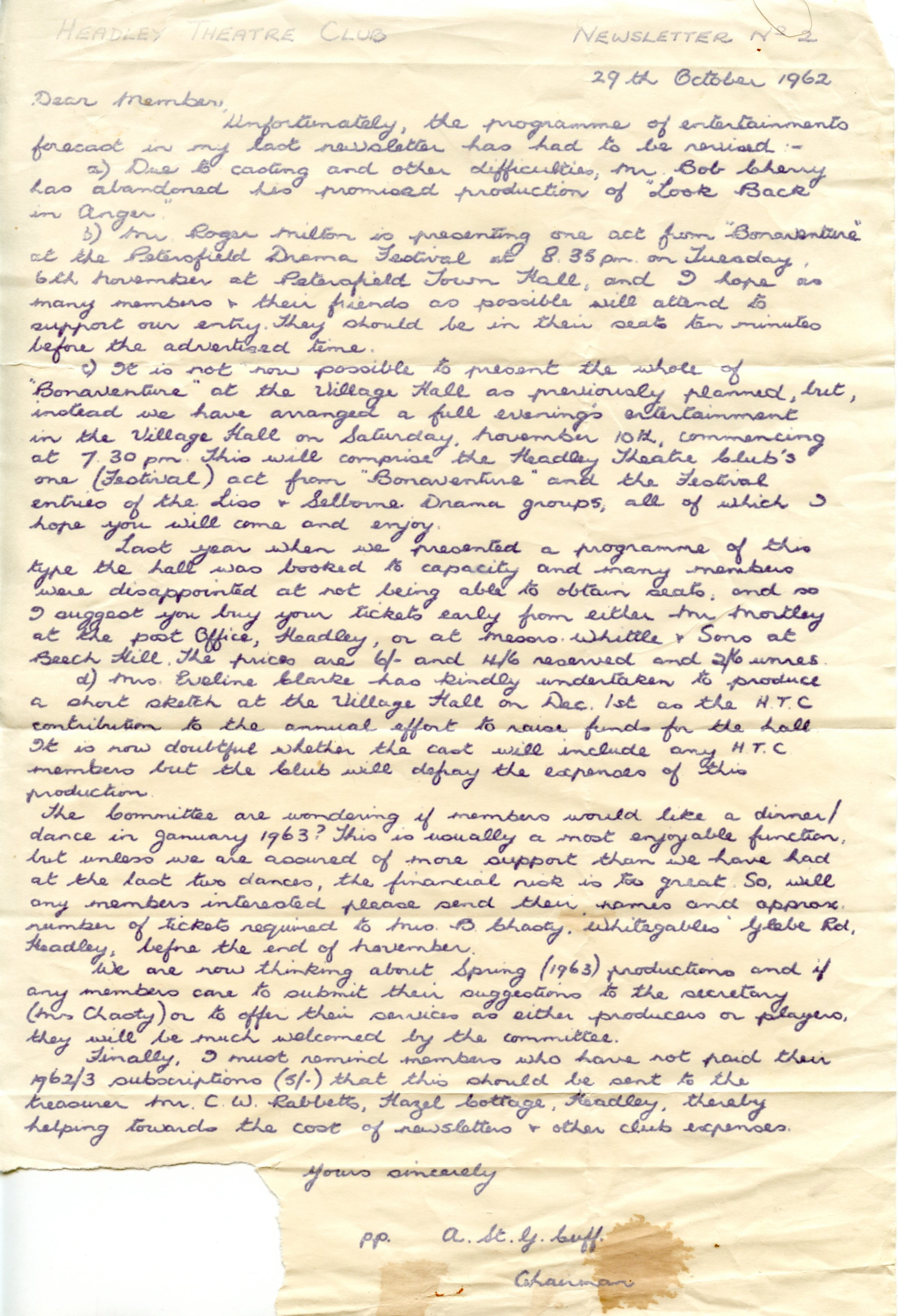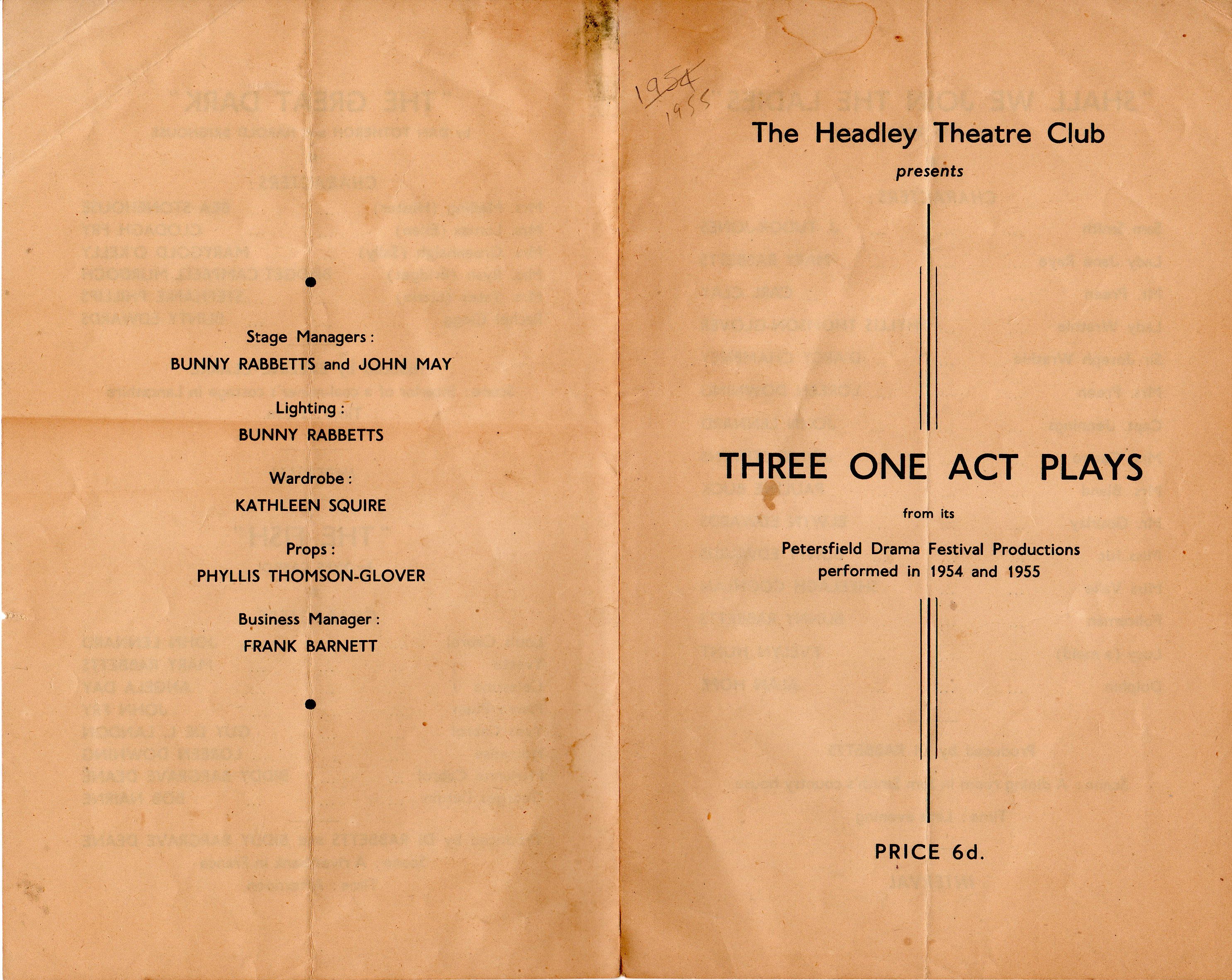 | Nov | Bonadventure (1-act) (director: Roger Milton) - first at Petersfield Drama Festival, then at Headley along with Festival entries from Liss & Selborne drama groups [info from a Newsletter dated 29 Oct 1962] |