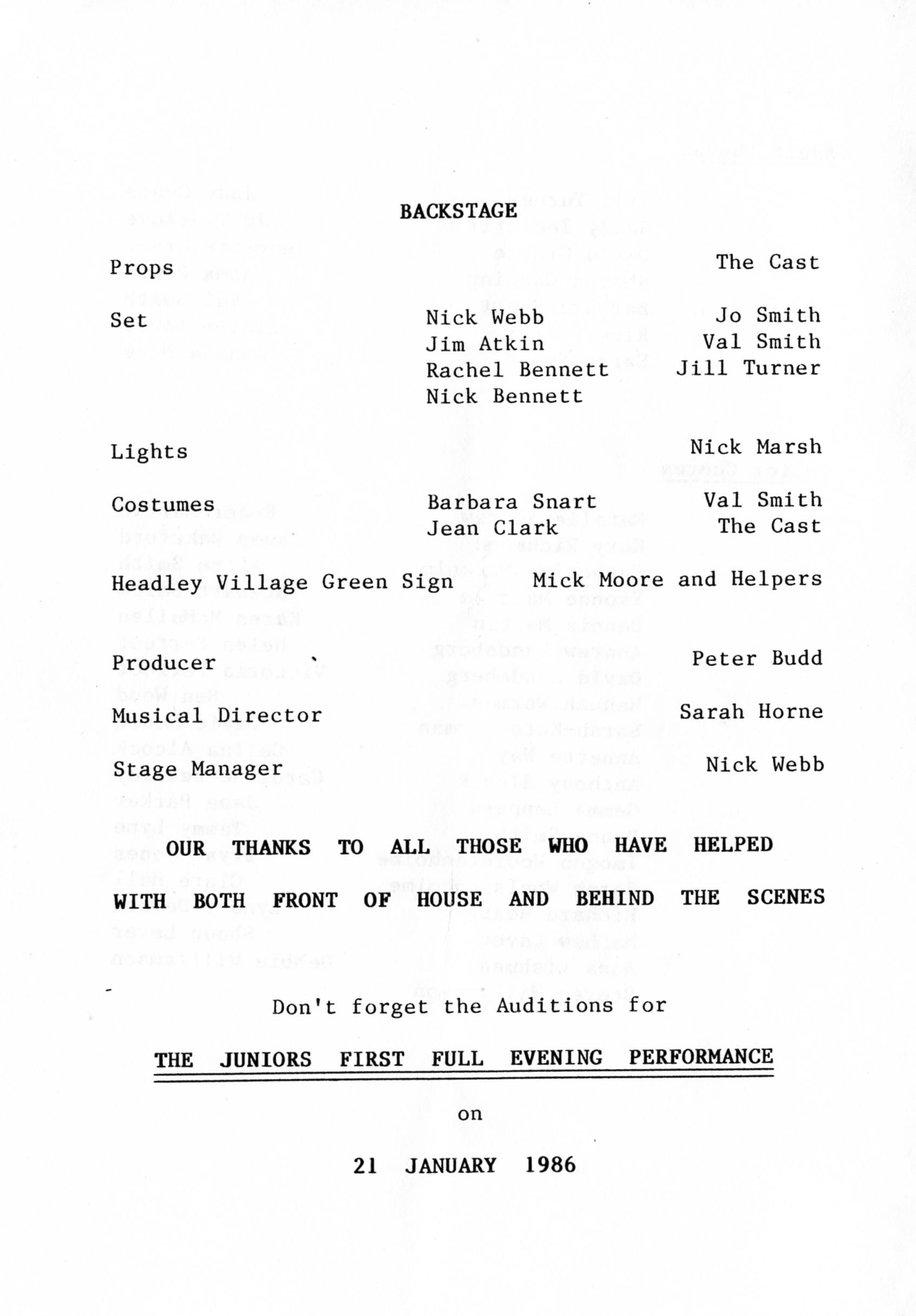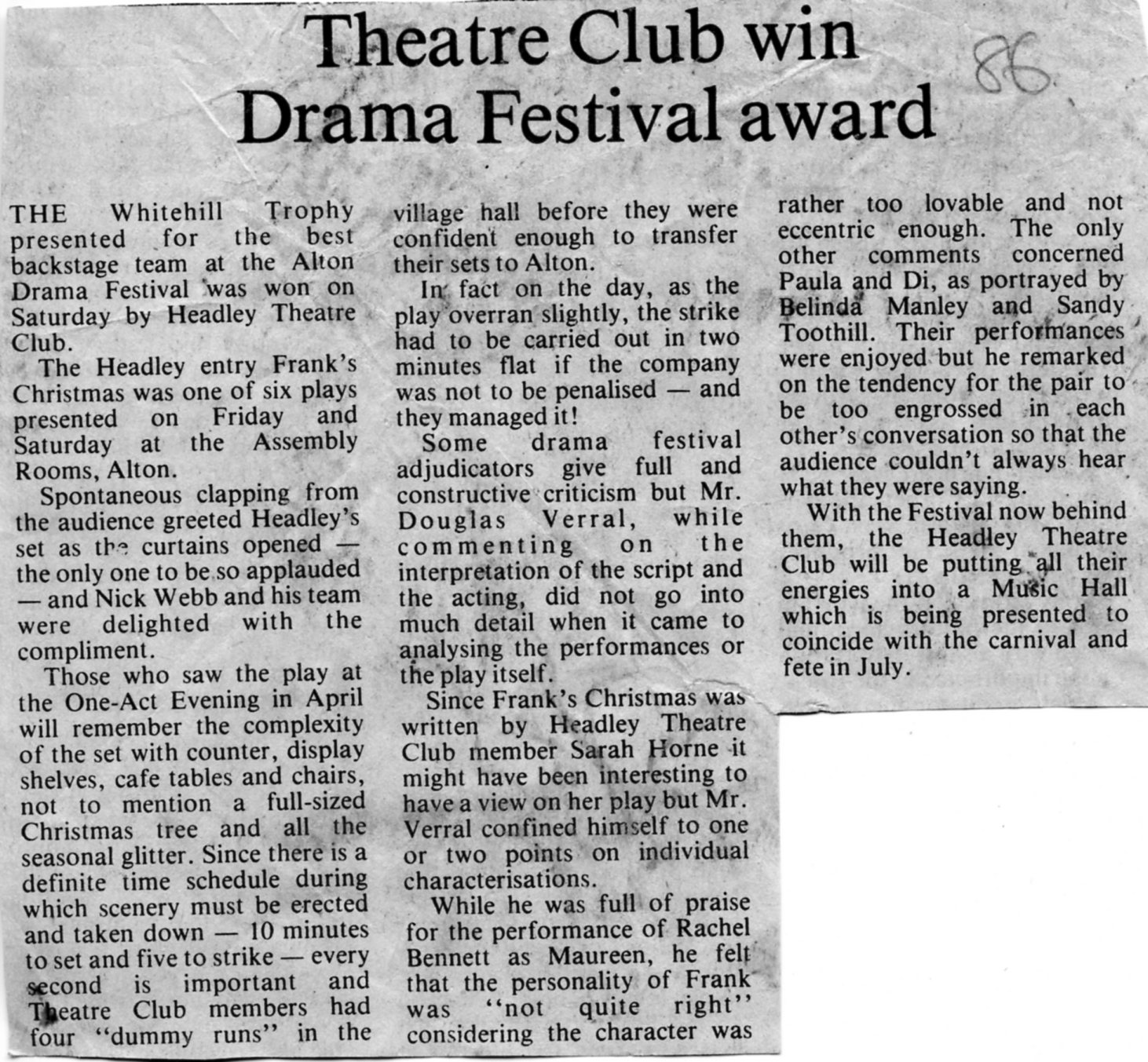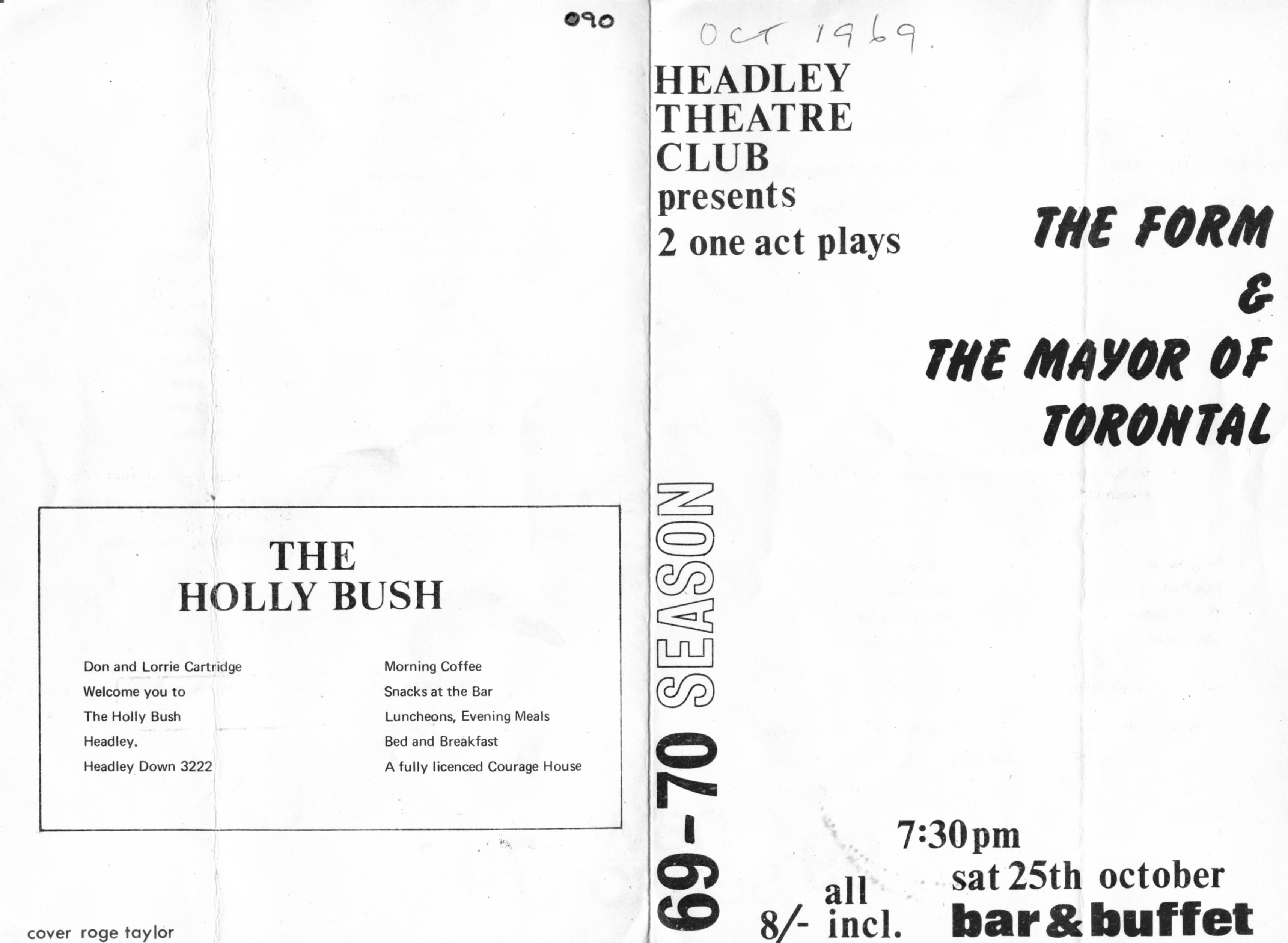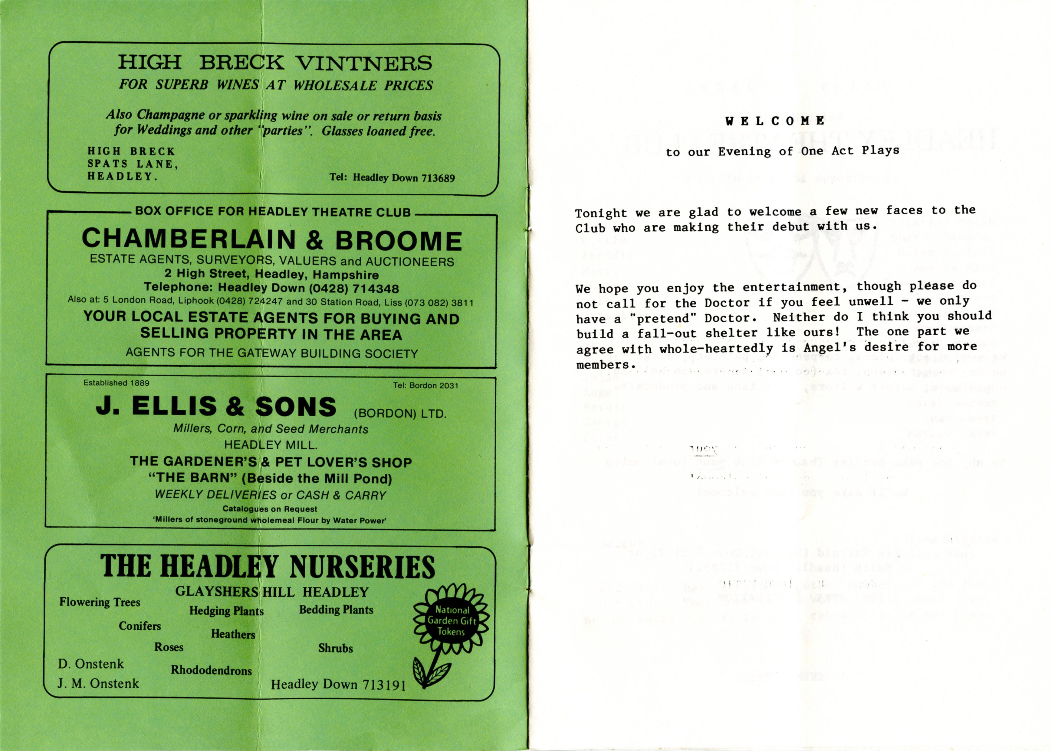 | Nov | Bonadventure (1-act) (director: Roger Milton) - first at Petersfield Drama Festival, then at Headley along with Festival entries from Liss & Selborne drama groups [info from a Newsletter dated 29 Oct 1962] |