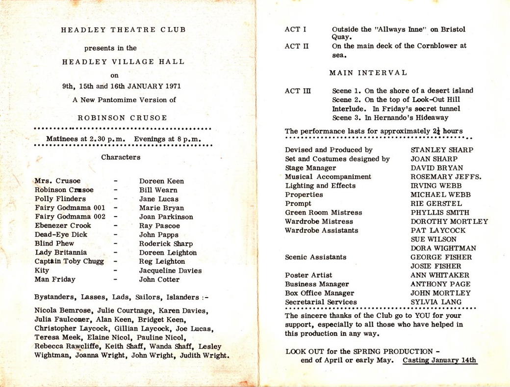 | 1971 | Robinson Crusoe (author/director: Stan Sharp) - flyer1 - flyer 2 - programme - report 1 - report 2 - photo |