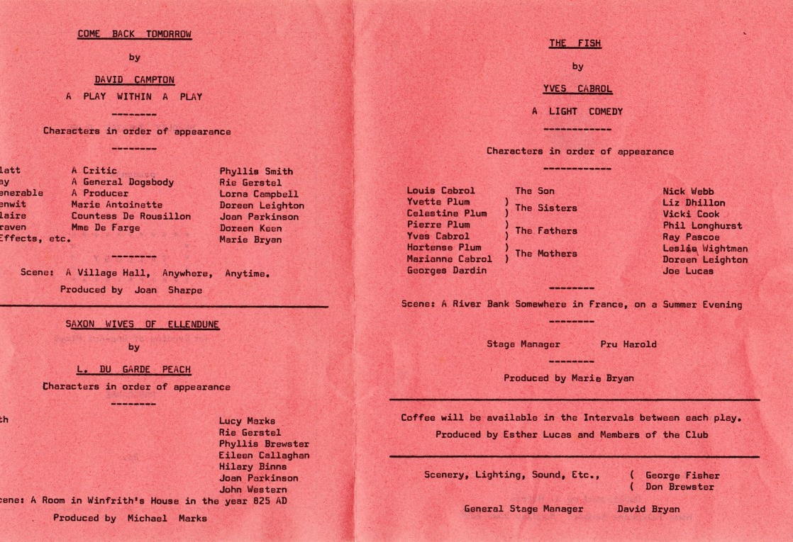 | May | Come Back Tomorrow / Saxon Wives of Ellendune / The Fish (1-acts) - programme - poster - report - photo of Come Back Tomorrow - photos from The Fish: #1 - photo #2 - photo #3 |