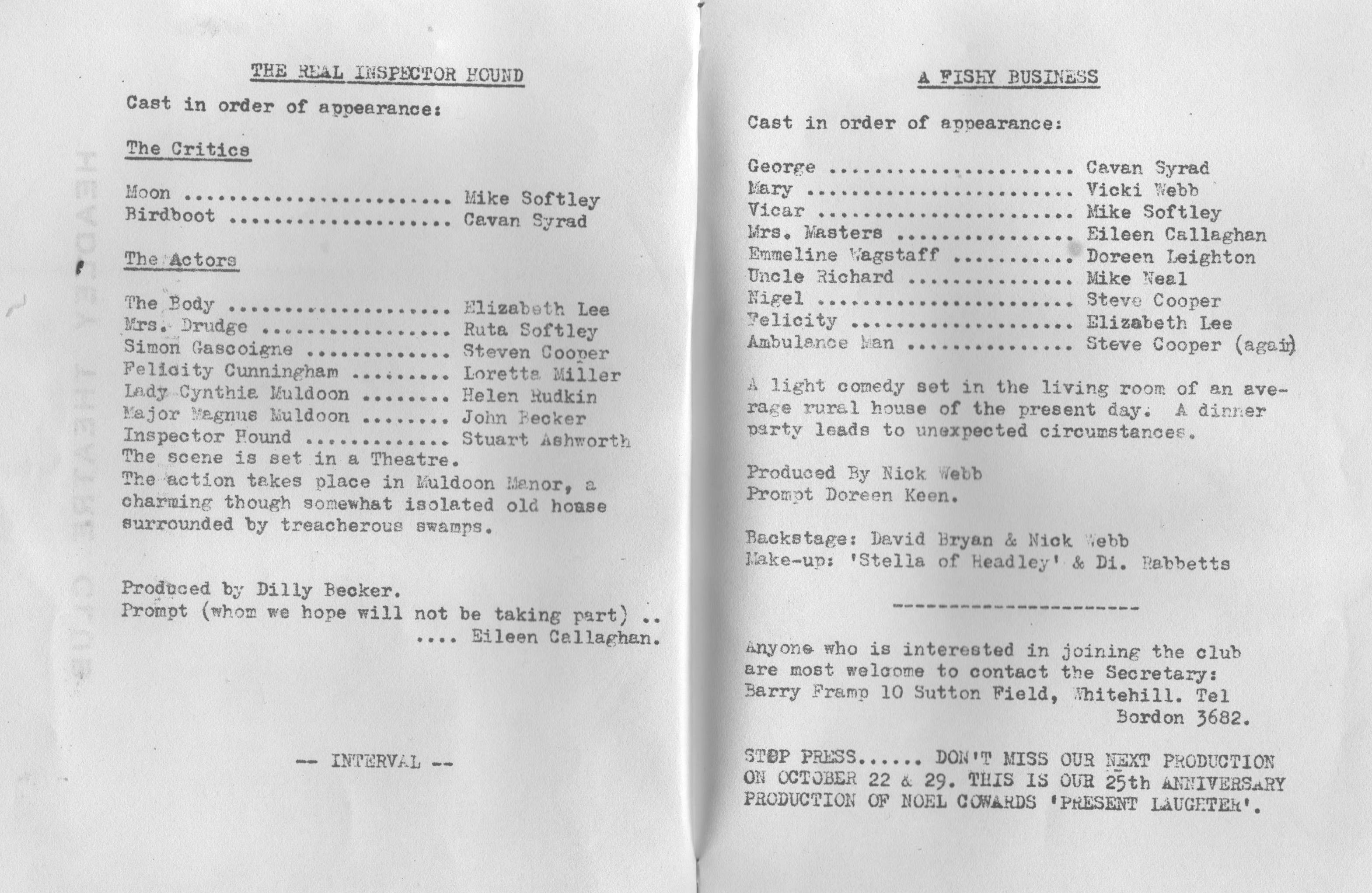 | Sep | The Real Inspector Hound / A Fishy Business (1-acts) (dir: Dilly Becker/Nick Webb) – programme – report – photos |