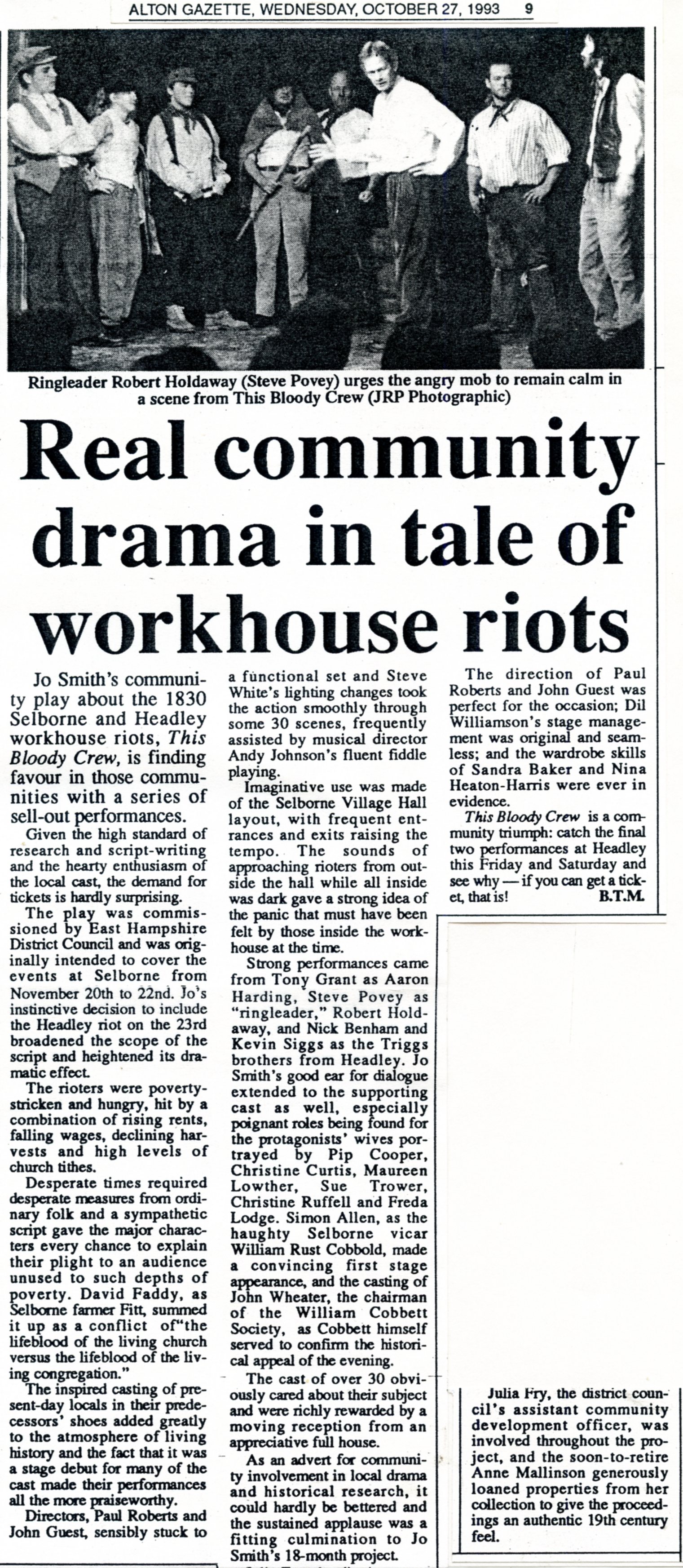 | Jul | BBC1 "Who Do You Think You Are?" — Lesley Manville is descended from Aaron Harding, one of 'our' rioters who was transported to Australia for the 1830 Workhouse Riot in Headley. See full programme on catch-up. |