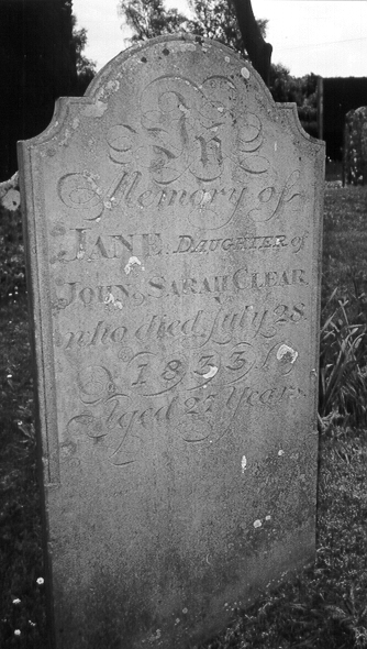 In memory of / Jane / daughter of John and Sarah CLEAR / who died / July 28, 1833 / aged 27 years [see photo] |
