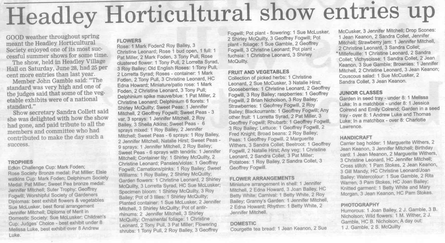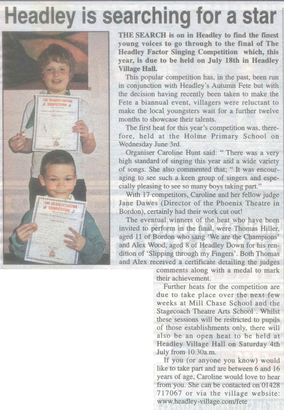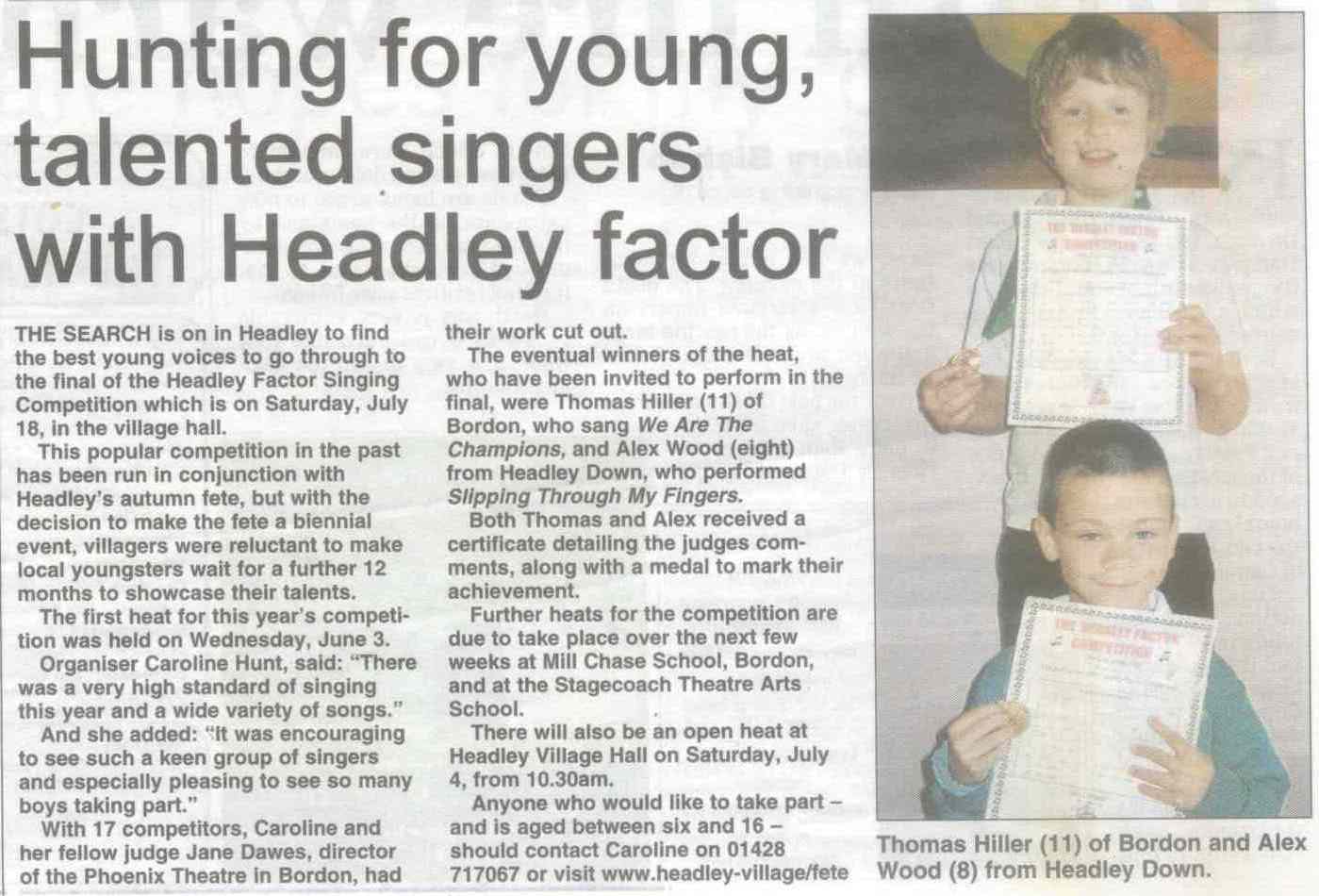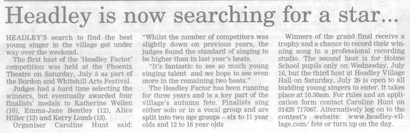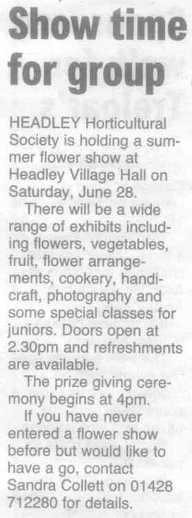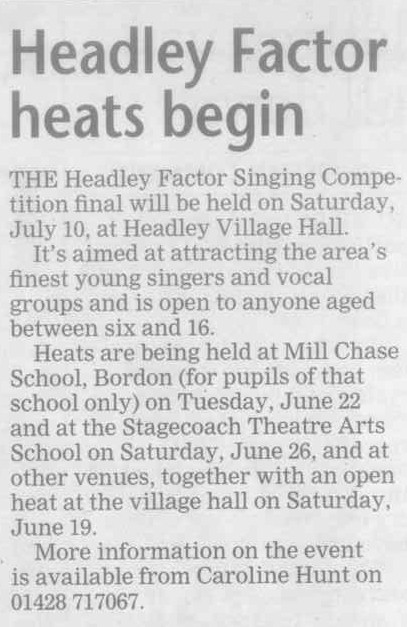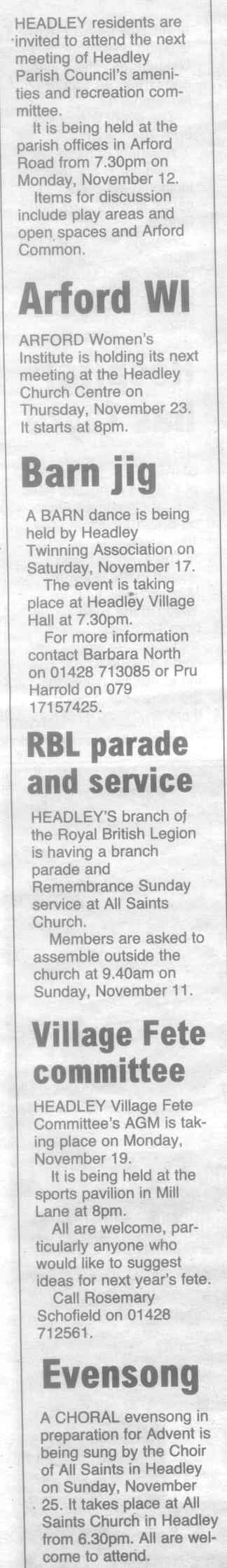 | 1970 | Jul-02-Hants Telegraph | Fancy dress winners at Headley Down fete - Jeremy Harvey, Helen Fenton, Gillian Wheeler, Sarah Fenton, Raymond Hill. Judges: F Longhurst, Miss M McAndrew, Mrs P Hone. | P | |