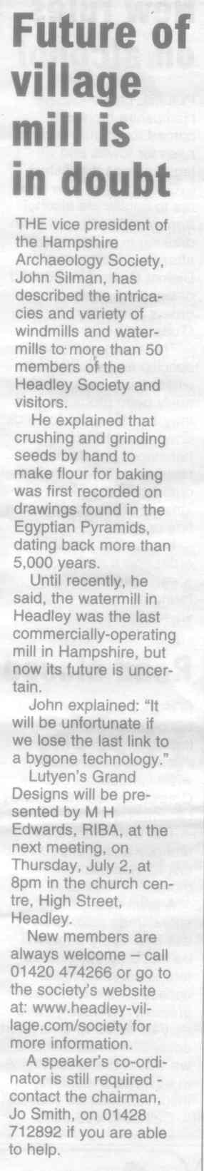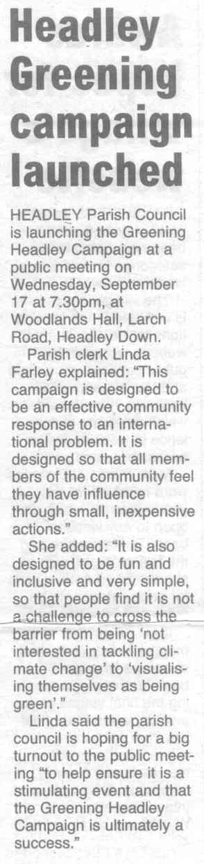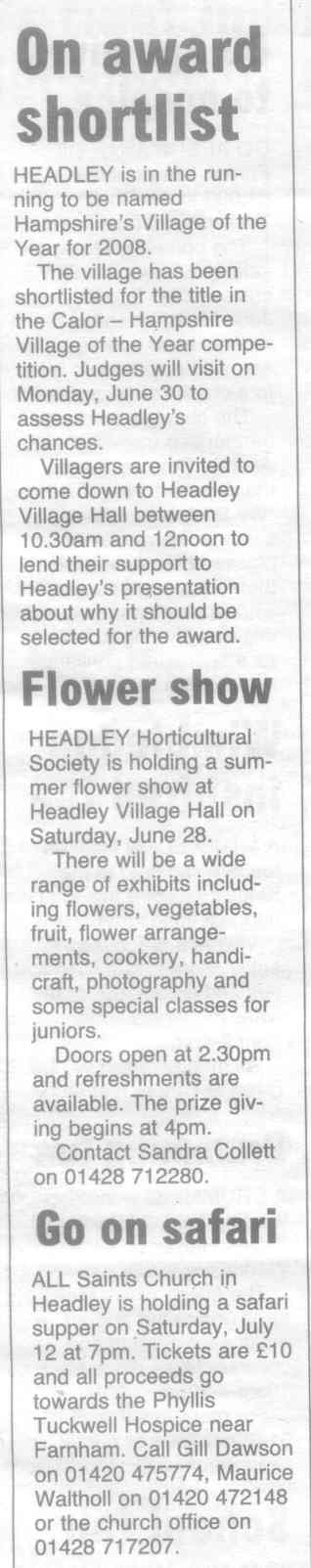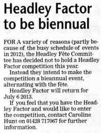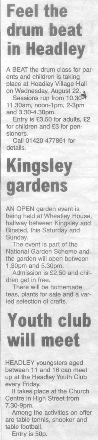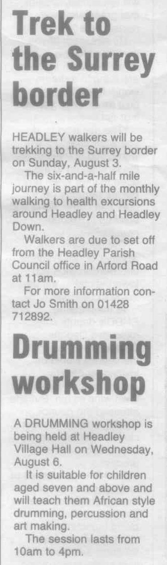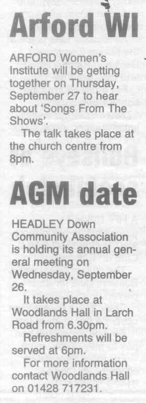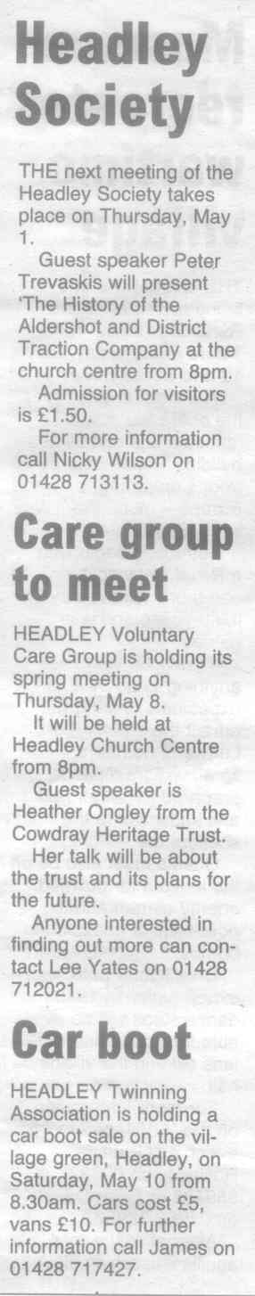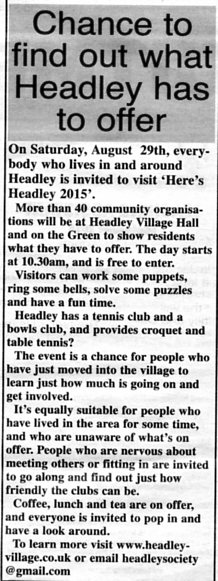 | 2015 | Aug-18-Messenger | 13 | Chance to find out what Headley has to offer - Headley Society to organise a "Here's Headley" event | |