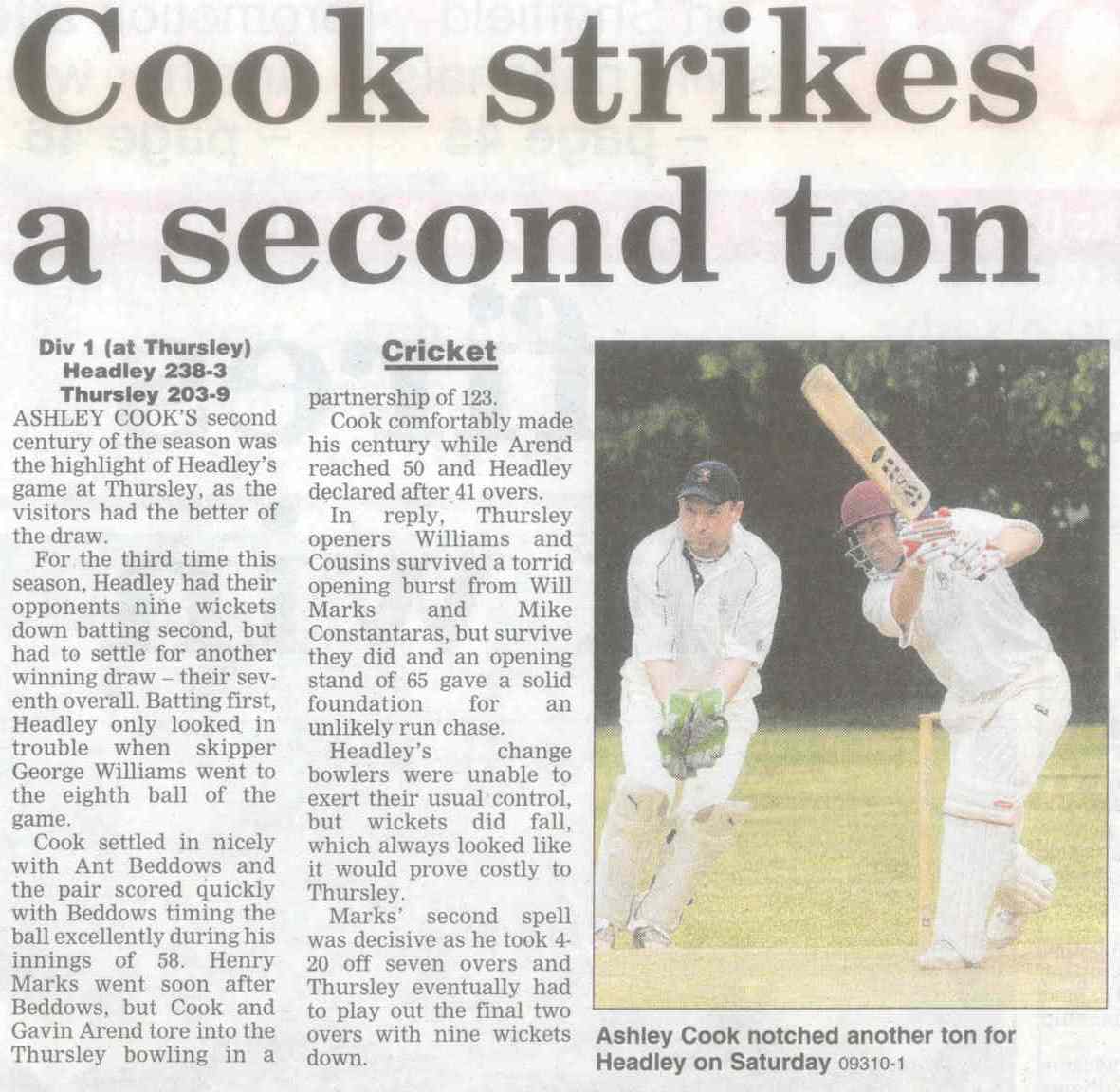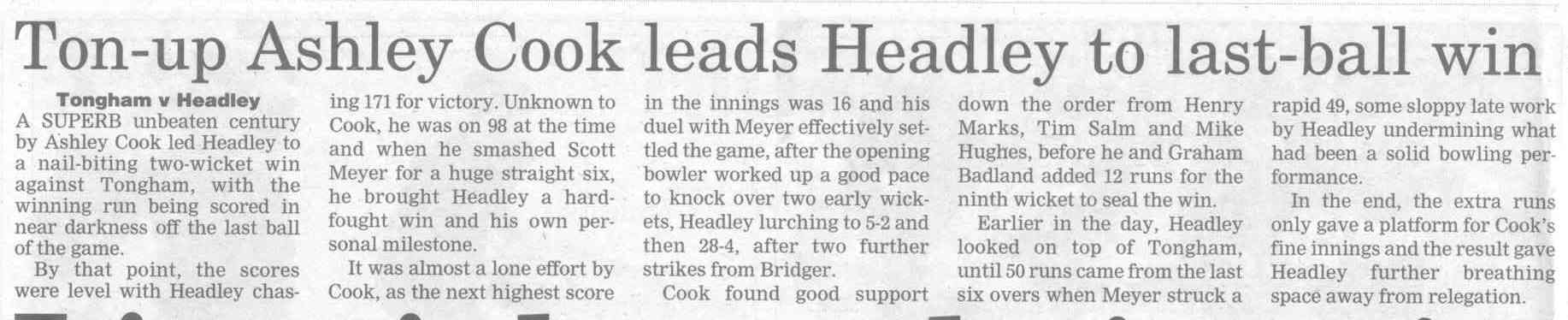 Cricket report: Ton-up Ashley Cook leads Headley to last-ball win | |