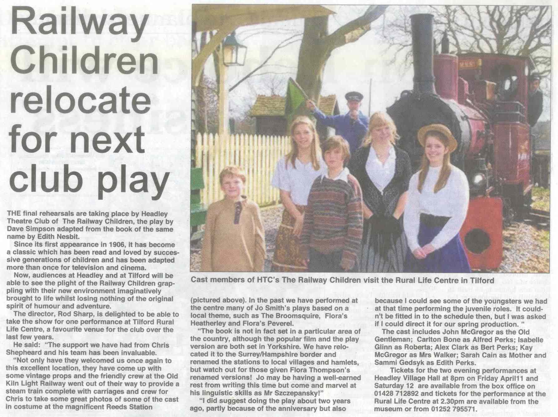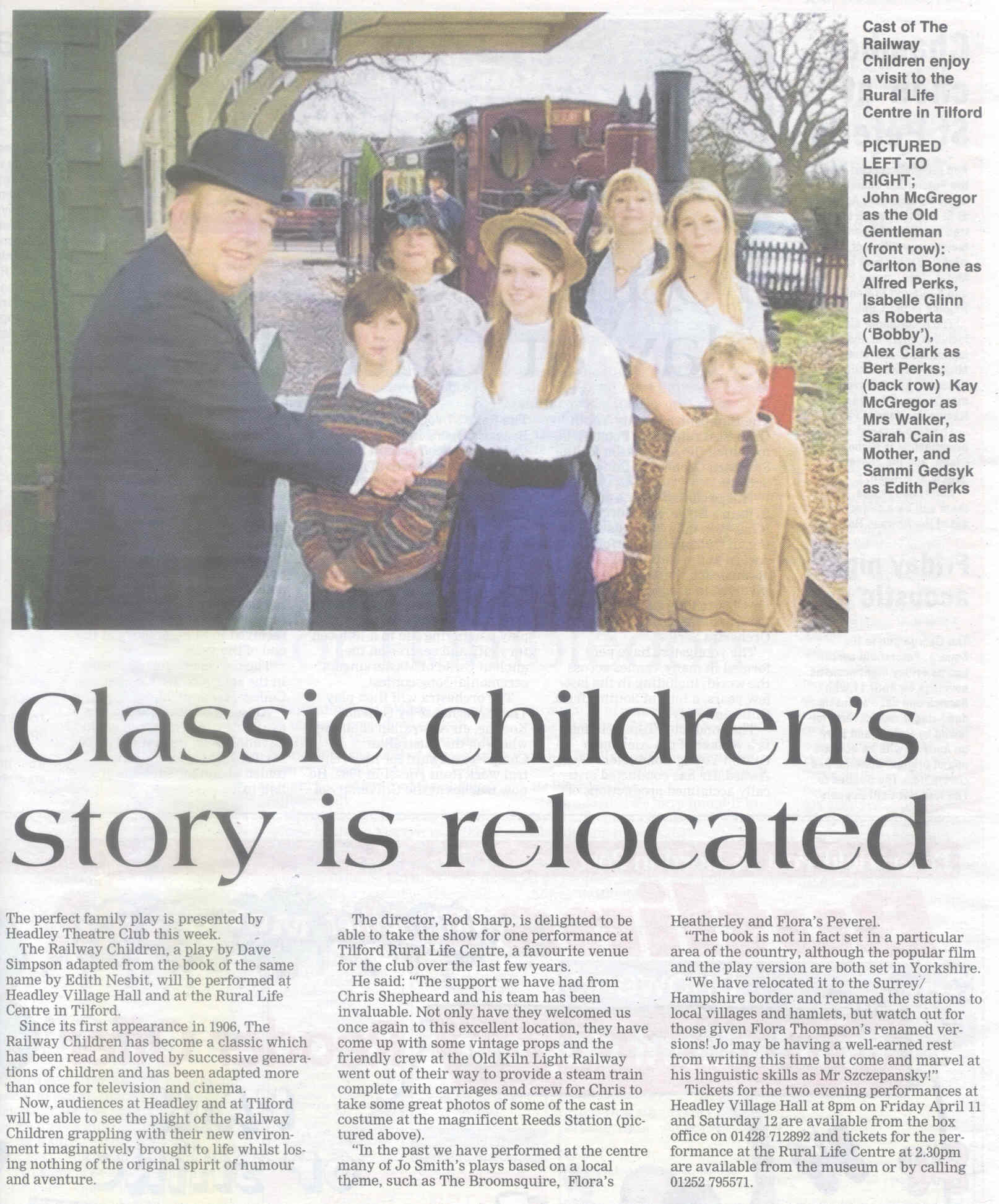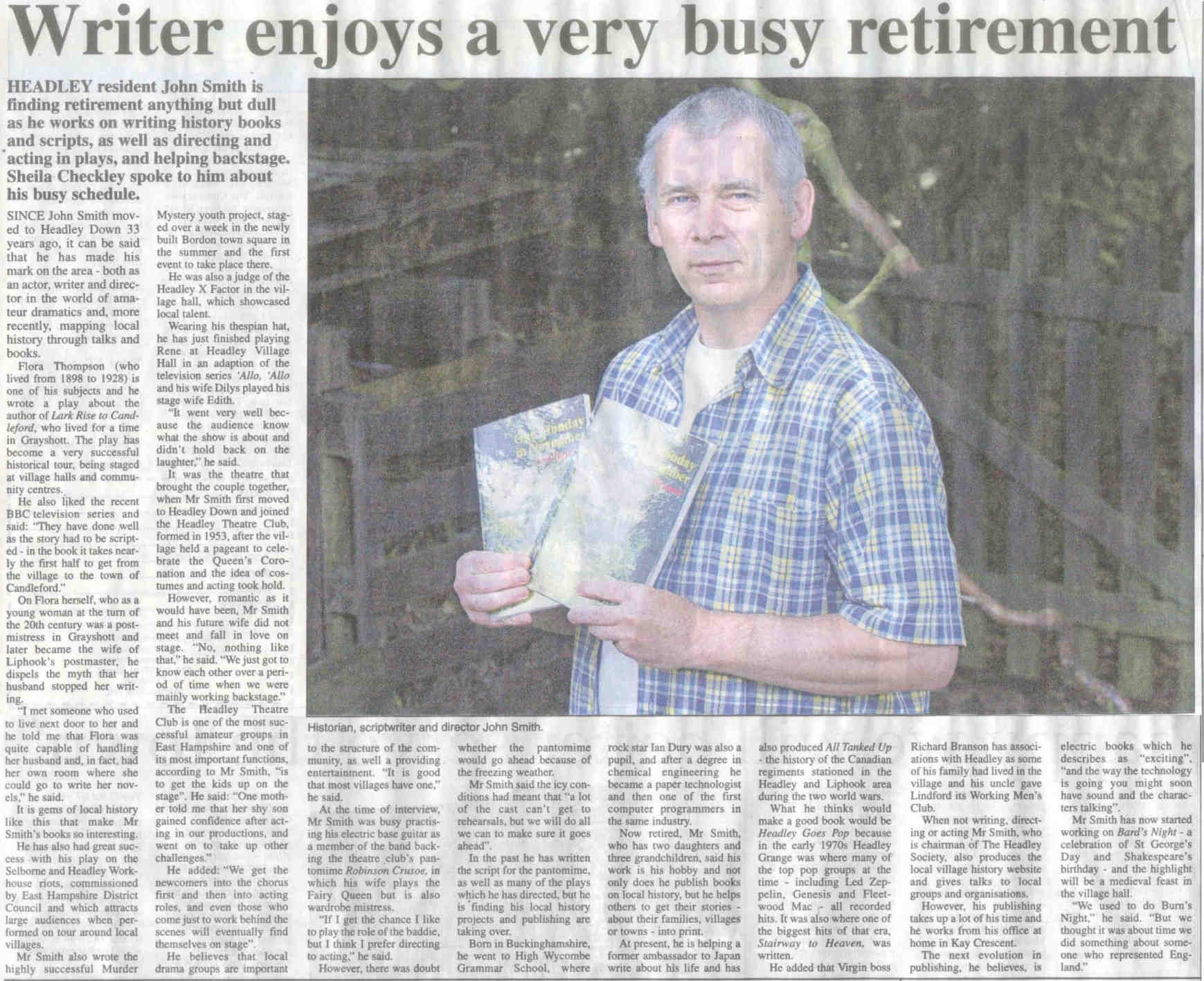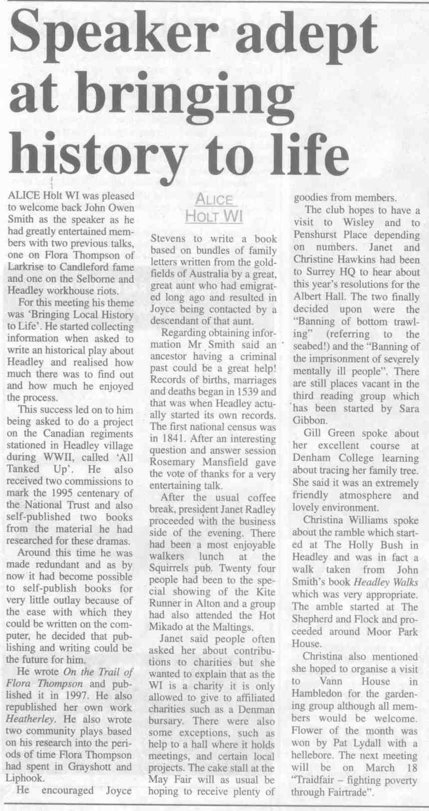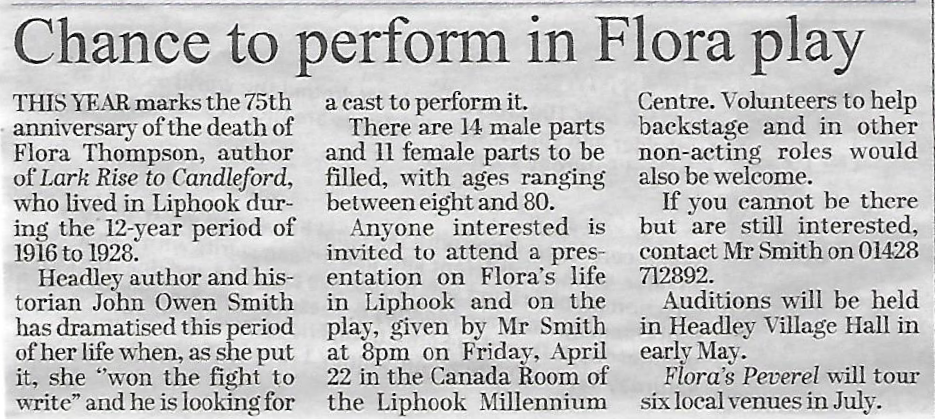 | 2016 | Apr-19-Messenger | 03 | Recreating Flora's time in Liphook - promoting performances of 'Lark Rise' by Headley Theatre Club in July (celebrating the centenary of her arrival in Liphook, not fifty years as stated) | |