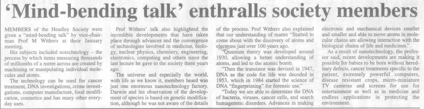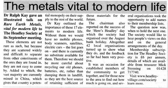 | 2015 | Sep-15-Messenger | 07 | The metals vital to modern life - report on Headley Society meeting and talk by Dr Ralph Kay | |