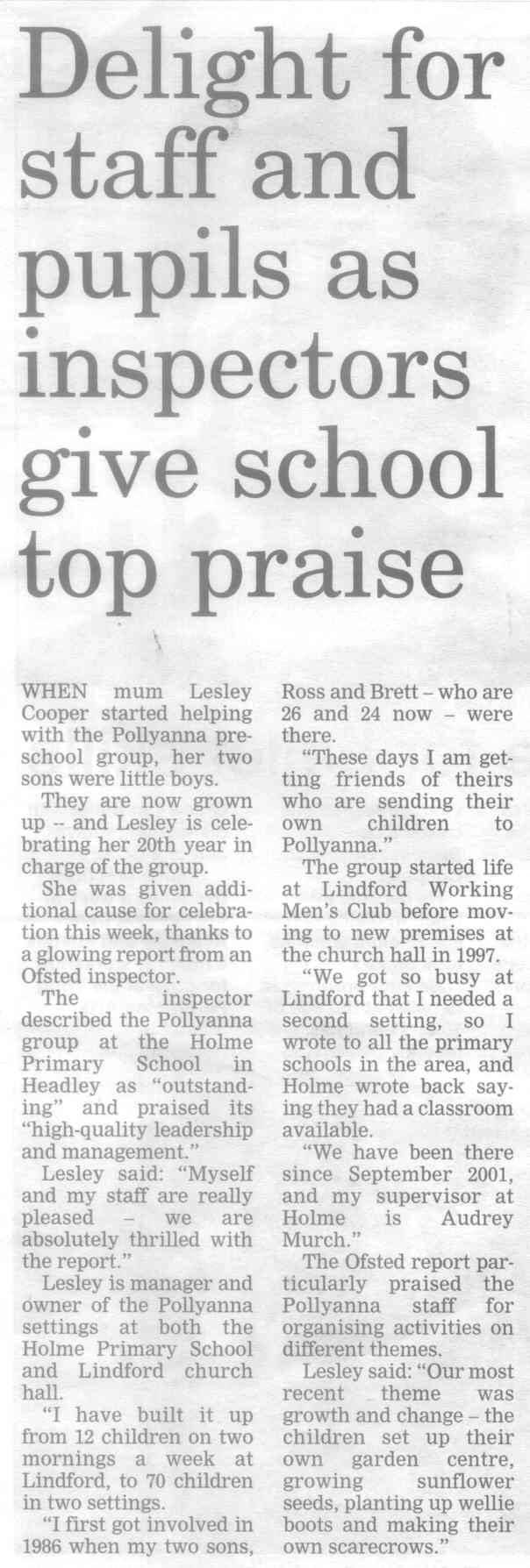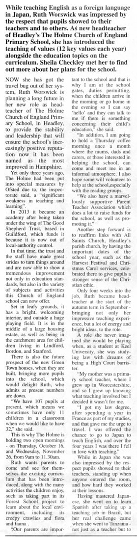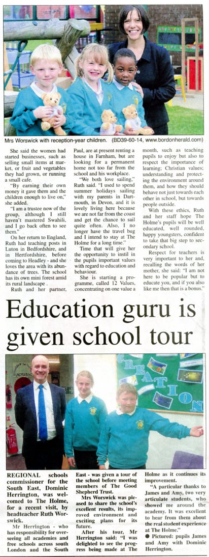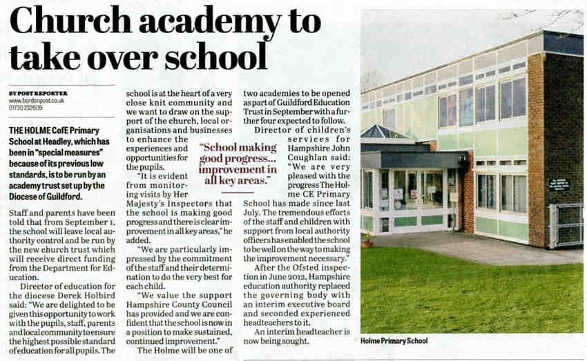 | 2016 | May-27-Bordon Herald | 03 | Holme Primary School rated 'good' in diocese inspection - Headley school praised for its values and inclusive nature | P |
