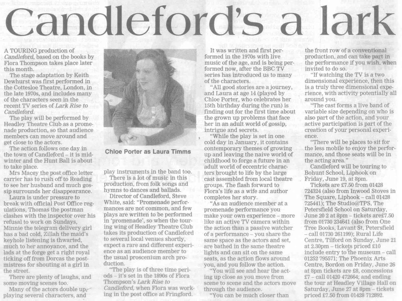 Tour and talk to mark Lark Rise author's arrival - Headley Theatre Club to tour 'Lark Rise' in July |