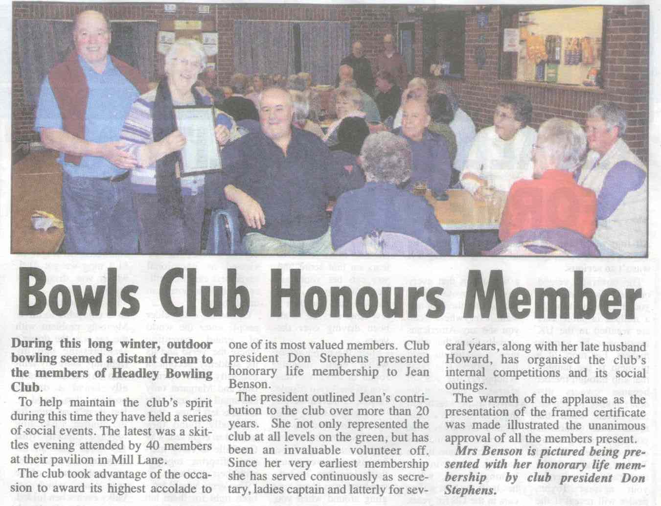 | 2018 | Jan-23-Messenger | 03 | Life presidency for Treasurer at Headley Bowls Club | P |