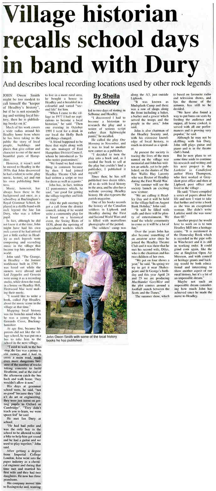 | 2015 | Mar-13-Bordon Herald | 03 | Village historian recalls school days in band with Ian Dury - interview with John Owen Smith of Headley Down | P |