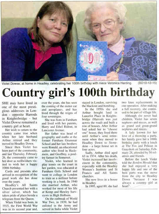 | 2015 | Mar-07-Bordon Herald | 05 | Country girl's 100th birthday - Vi Dowse (née Ridout) of Headley | P |