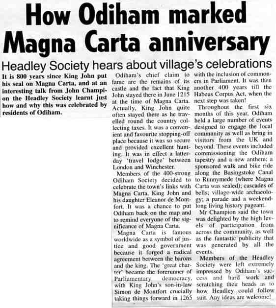 | 2015 | Oct 13-Messenger | 02 | How Odiham marked Magna Carta anniversary - talk to Headley Society by John Champion | |