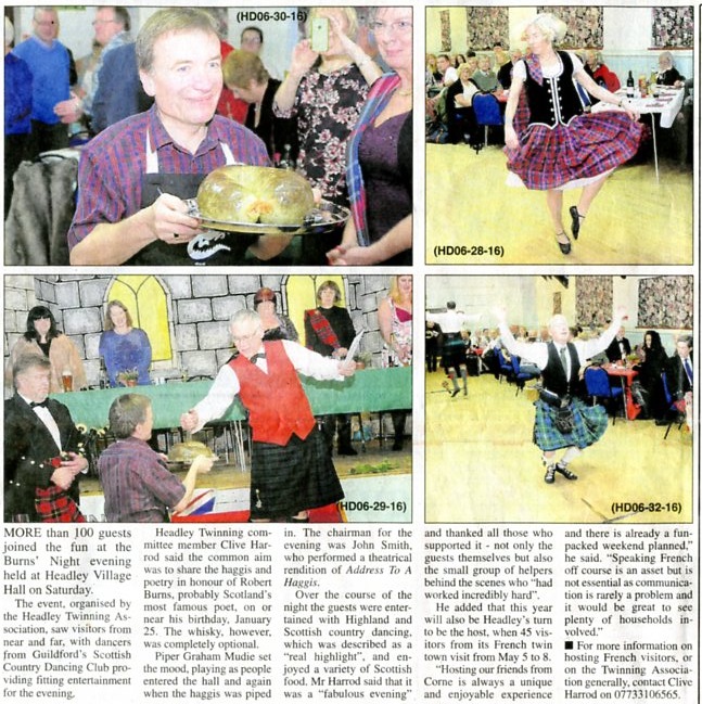 | 2016 | Feb-05-Bordon Herald | 05 | Burns Night brings out the Scots' piping, dancing and merrymaking - more pics & report - Headley Twinning Association holds a Burns Night in Headley Village Hall | PP |