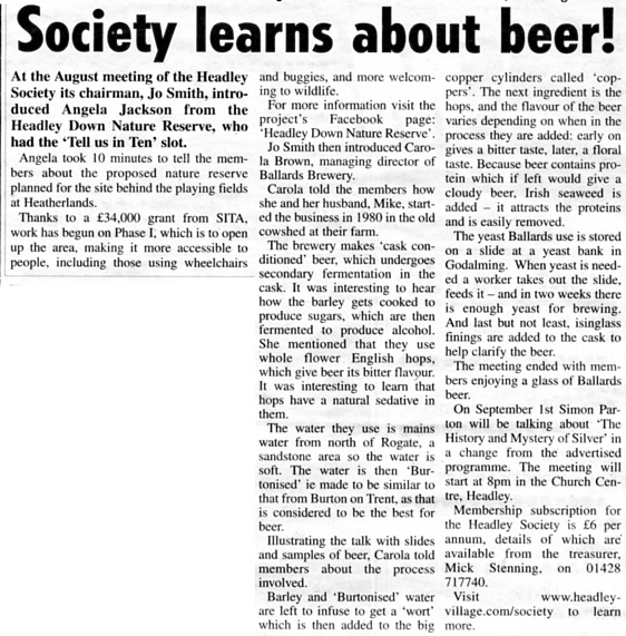 | 2016 | Aug-23-Messenger | 02 | Society learns about beer! - talk to Headley Society by Ballards Brewery | |