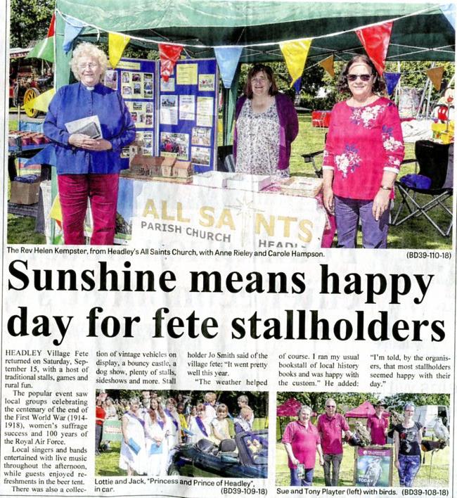 | 2018 | Sep-20-Bordon Herald | 03 | Sunshine means happy day for fete stallholders - Headley Village Fete - All Saints stalll | P |