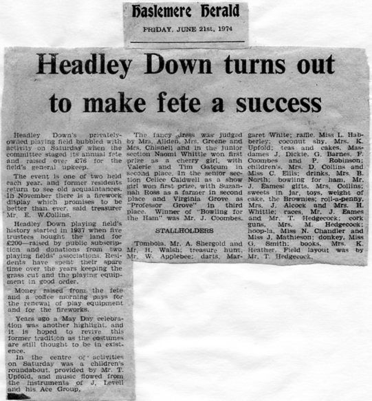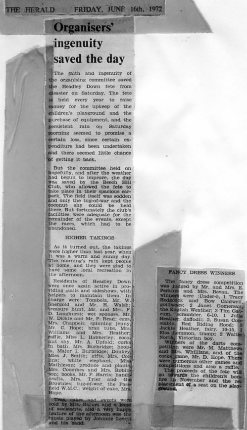 | 1972 | Jun-16-Haslemere Herald | Organisers' ingenuity saved the day - Headley Down fete almost rained off | ||