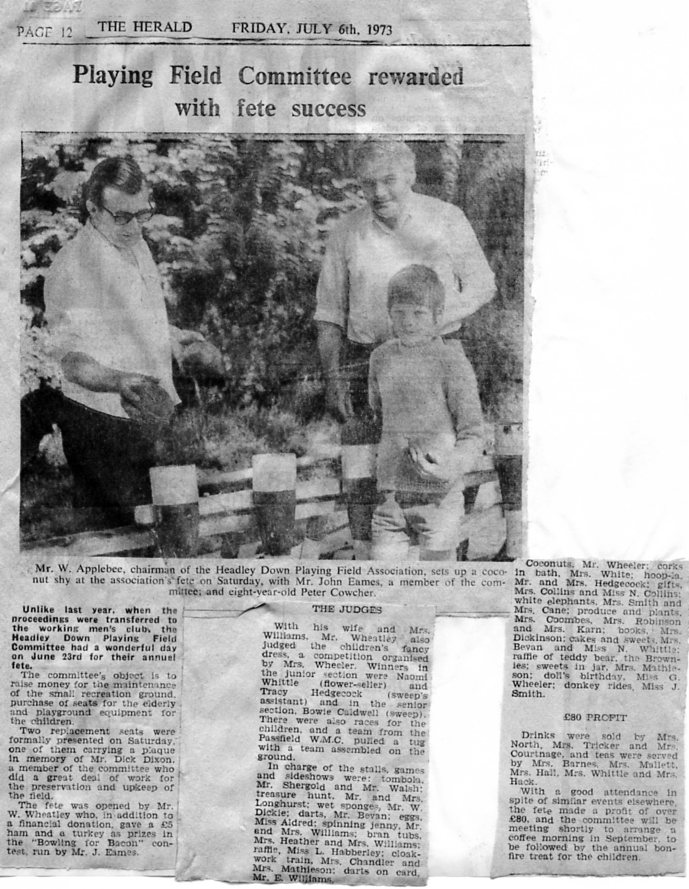 | 1972 | Sep-14-Hants Telegraph | 'Private' field provides fun for Headley children - Playing field at Headley Down bought in 1937 | P | |