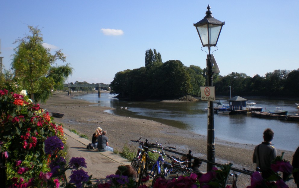 Never mind, we made it to Chiswick for a late lunch at the Bell and Crown by the River Thames – the tide was out, as you can see from this view downstream past Oliver's Island, but the food was good. |